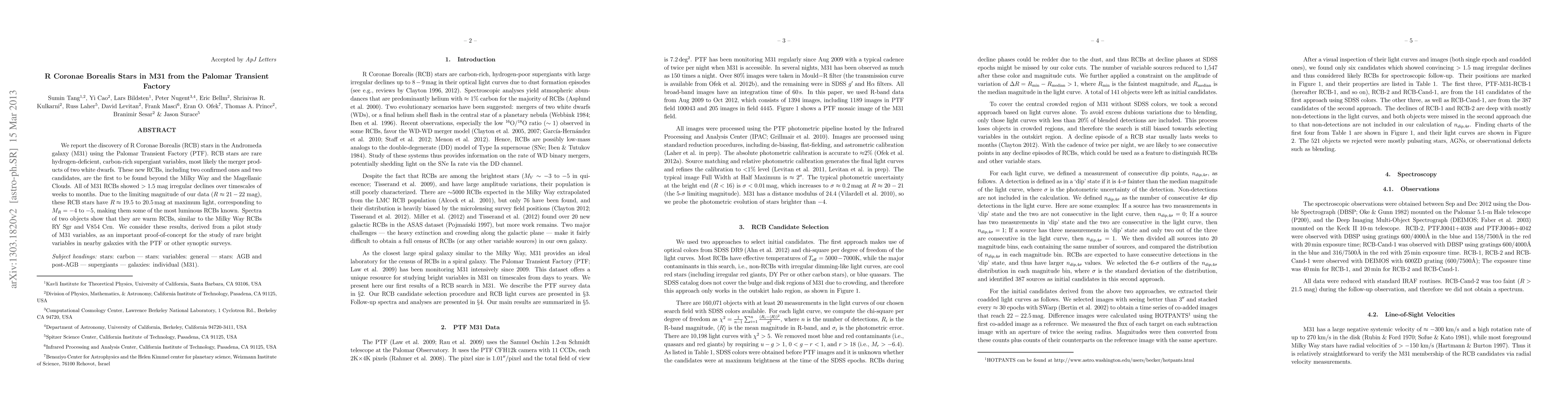 The Palomar Transient Factory discovered the first R Coronae Borealis stars in the Andromeda galaxy (M31), revealing rare, luminous, carbon-rich supergiant variables with significant irregular declines in brightness. These findings serve as a proof-of-concept for studying rare bright variables in nearby galaxies using synoptic surveys.