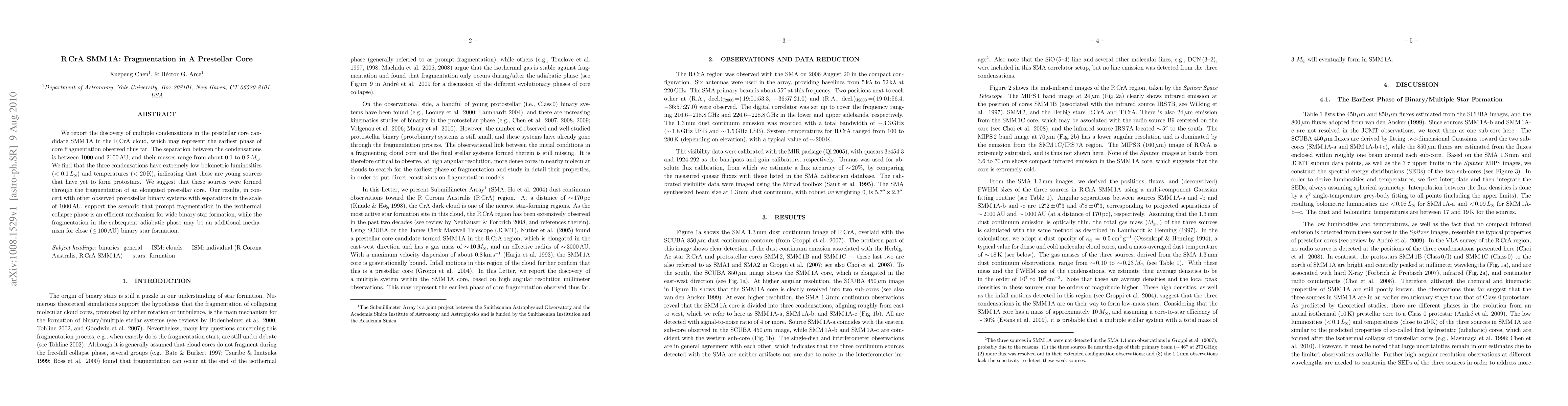We report the discovery of multiple condensations in the prestellar core candidate SMM1A in the R~CrA cloud, which may represent the earliest phase of core fragmentation observed thus far. The separation between the condensations is between 1000 and 2100 AU, and their masses range from about 0.1 to 0.2 M_sun. We find that the three condensations have extremely low bolometric luminosities (< 0.1 L_sun) and temperatures (< 20 K), indicating that these are young sources that have yet to form protostars. We suggest that these sources were formed through the fragmentation of an elongated prestellar core. Our results, in concert with other observed protostellar binary systems with separations in the scale of 1000 AU, support the scenario that prompt fragmentation in the isothermal collapse phase is an efficient mechanism for wide binary star formation, while the fragmentation in the subsequent adiabatic phase may be an additional mechanism for close (< 100 AU) binary star formation.