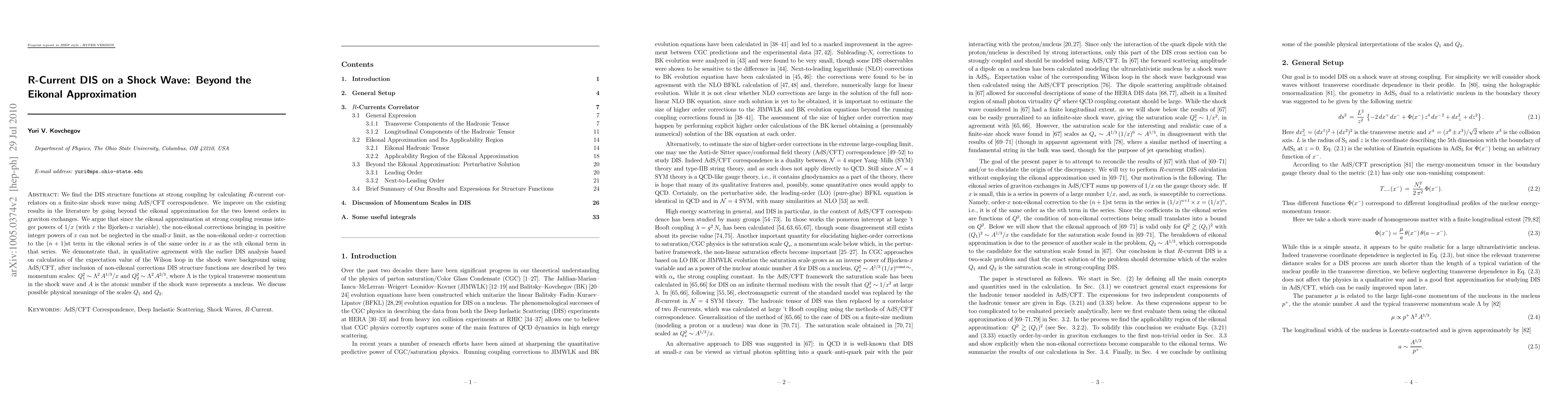 This paper calculates DIS structure functions at strong coupling by analyzing R-current correlators on a shock wave using AdS/CFT correspondence, improving on prior results by going beyond the eikonal approximation. The study finds that non-eikonal corrections are significant in the small-x limit, leading to two momentum scales in the structure functions: Q_1^2 ~ \Lambda^2 \, A^{1/3}/x and Q_2^2 ~ \Lambda^2 \, A^{2/3}.