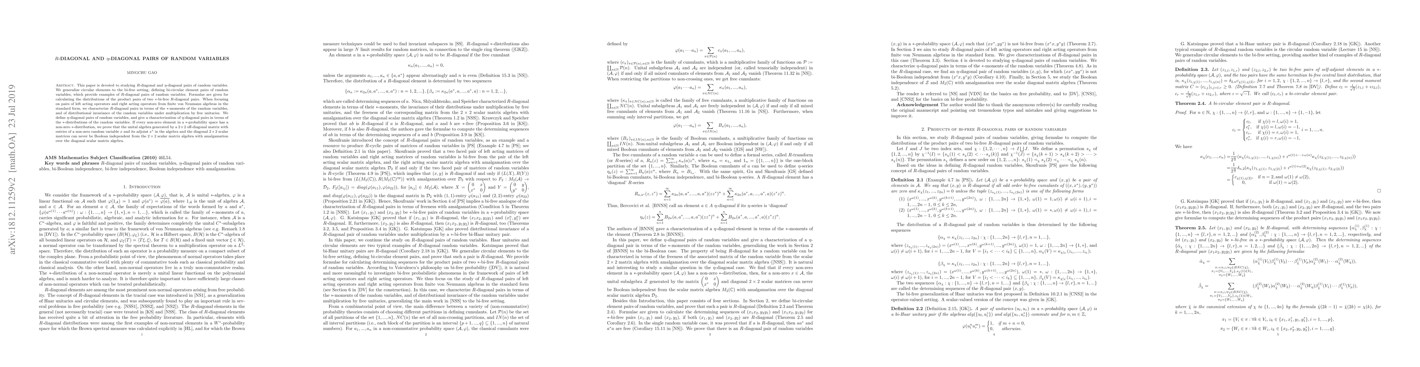 This paper investigates $R$-diagonal and $\eta$-diagonal pairs of random variables, generalizing circular elements in the bi-free setting and providing formulae for their product distributions. It characterizes $R$-diagonal pairs through $*$-moments and distributional invariance by free unitaries, and defines $\eta$-diagonal pairs based on $*$-distributions. It concludes by proving that certain algebras generated by random variables and their adjoints cannot be Boolean independent from a specific scalar matrix algebra.