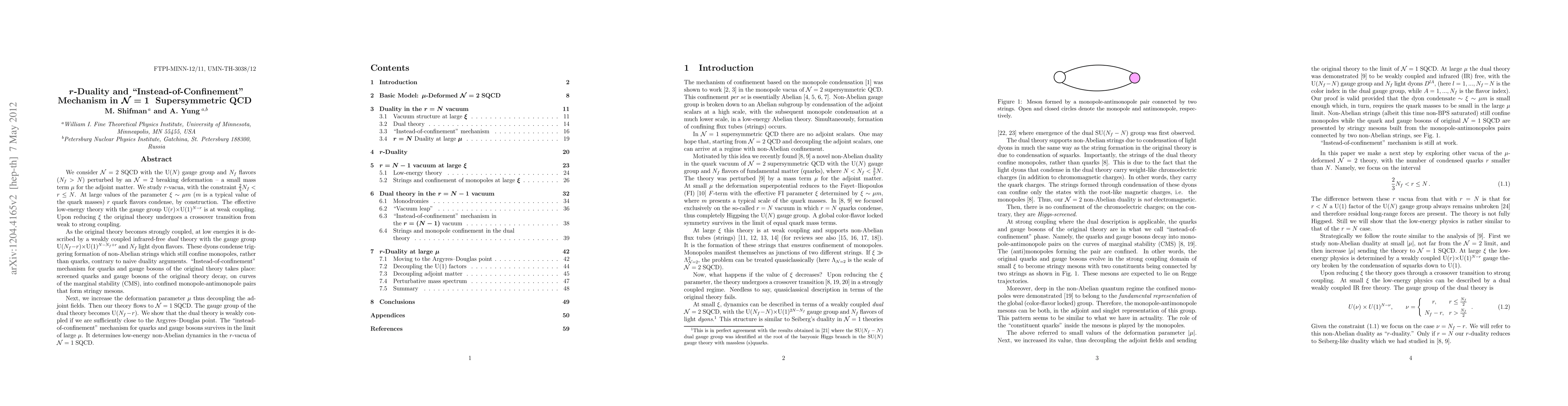 We consider N=2 SQCD with the U(N) gauge group and N_f flavors (N_f>N) perturbed by an N=2 breaking deformation - a small mass term \mu for the adjoint matter. We study r-vacua, with the constraint $2N_f/3 < r \le N. At large values of the parameter \xi\sim\mu m (m is a typical value of the quark masses) r quark flavors condense, by construction. The effective low-energy theory with the gauge group U(r)\times U(1)^{N-r} is at weak coupling. Upon reducing \xi the original theory undergoes a crossover transition from weak to strong coupling. As the original theory becomes strongly coupled, at low energies it is described by a weakly coupled infrared-free dual theory with the gauge group U(N_f-r)\times U(1)^{N-N_f+r} and N_f light dyon flavors. These dyons condense triggering formation of non-Abelian strings which still confine monopoles, rather than quarks, contrary to naive duality arguments. "Instead-of-confinement" mechanism for quarks and gauge bosons of the original theory takes place: screened quarks and gauge bosons of the original theory decay, on curves of the marginal stability (CMS), into confined monopole-antimonopole pairs that form stringy mesons. Next, we increase the deformation parameter \mu thus decoupling the adjoint fields. Then our theory flows to N=1 SQCD. The gauge group of the dual theory becomes U(N_f-r). We show that the dual theory is weakly coupled if we are sufficiently close to the Argyres-Douglas point. The "instead-of-confinement" mechanism for quarks and gauge bosons survives in the limit of large \mu. It determines low-energy non-Abelian dynamics in the r-vacua of N=1 SQCD.