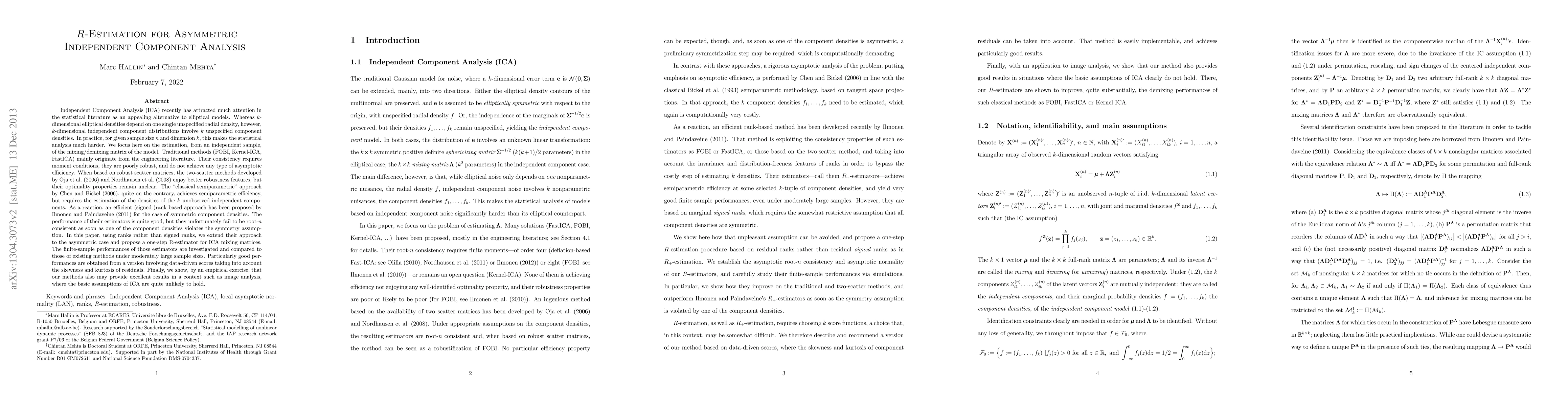 Independent Component Analysis (ICA) recently has attracted attention in the statistical literature as an alternative to elliptical models. Whereas k-dimensional elliptical densities depend on one single unspecified radial density, however, k-dimensional independent component distributions involve k unspecified component densities that for given sample size n and dimension k making statistical analysis harder. We focus here on estimating the model's mixing matrix. Traditional methods (FOBI, Kernel-ICA, FastICA) originating from the engineering literature have consistency that requires moment conditions without achieving any type of asymptotic efficiency. When based on robust scatter matrices, the two-scatter methods developed by Oja, et al. (2006) and Nordhausen, et al. (2008) enjoy better robustness features but have unclear optimality properties. The semiparametric approach by Chen and Bickel (2006) achieves semiparametric efficiency but requires estimating the k unobserved independent component densities. As a reaction, an efficient (signed-)rank-based approach has been proposed by Ilmonen and Paindaveine (2011) for the case of symmetric component densities that fail to be root-n consistent as soon as one of the component densities is asymmetric. In this paper, using ranks rather than signed ranks, we extend their approach to the asymmetric case and propose a one-step R-estimator for ICA mixing matrices. The finite-sample performances of those estimators are investigated and compared to those of existing methods under moderately large sample sizes. Particularly good performances are obtained when using data-driven scores taking into account the skewness and kurtosis of residuals. Finally, we show, by an empirical exercise, that our methods also may provide excellent results in a context such as image analysis, where the basic assumptions of ICA are quite unlikely to hold.