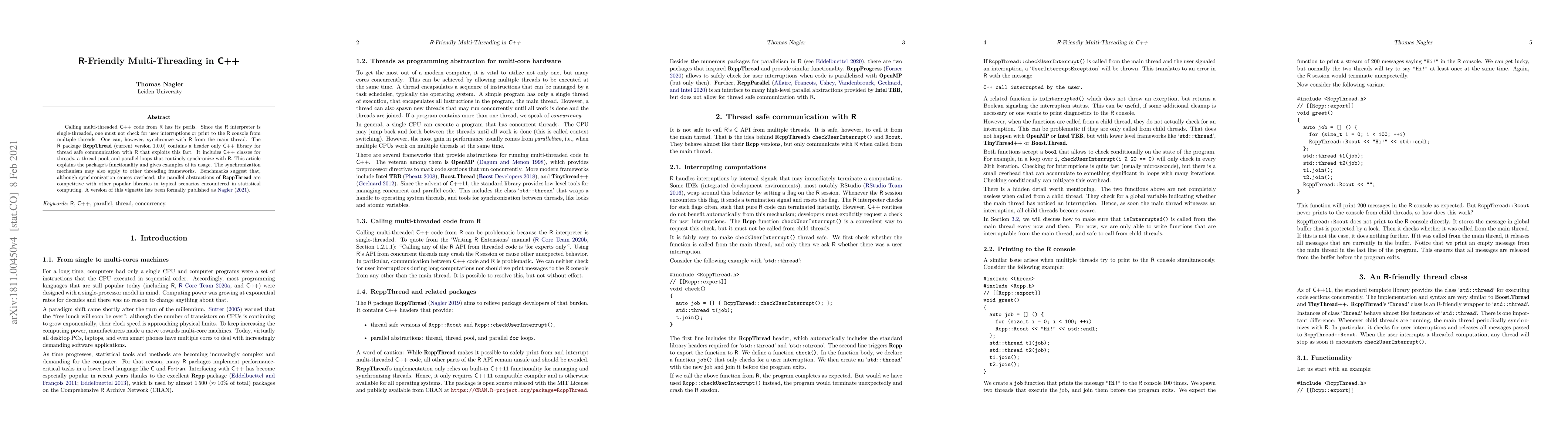 Calling multi-threaded C++ code from R has its perils. Since the R interpreter is single-threaded, one must not check for user interruptions or print to the R console from multiple threads. One can, however, synchronize with R from the main thread. The R package RcppThread (current version 1.0.0) contains a header only C++ library for thread safe communication with R that exploits this fact. It includes C++ classes for threads, a thread pool, and parallel loops that routinely synchronize with R. This article explains the package's functionality and gives examples of its usage. The synchronization mechanism may also apply to other threading frameworks. Benchmarks suggest that, although synchronization causes overhead, the parallel abstractions of RcppThread are competitive with other popular libraries in typical scenarios encountered in statistical computing.