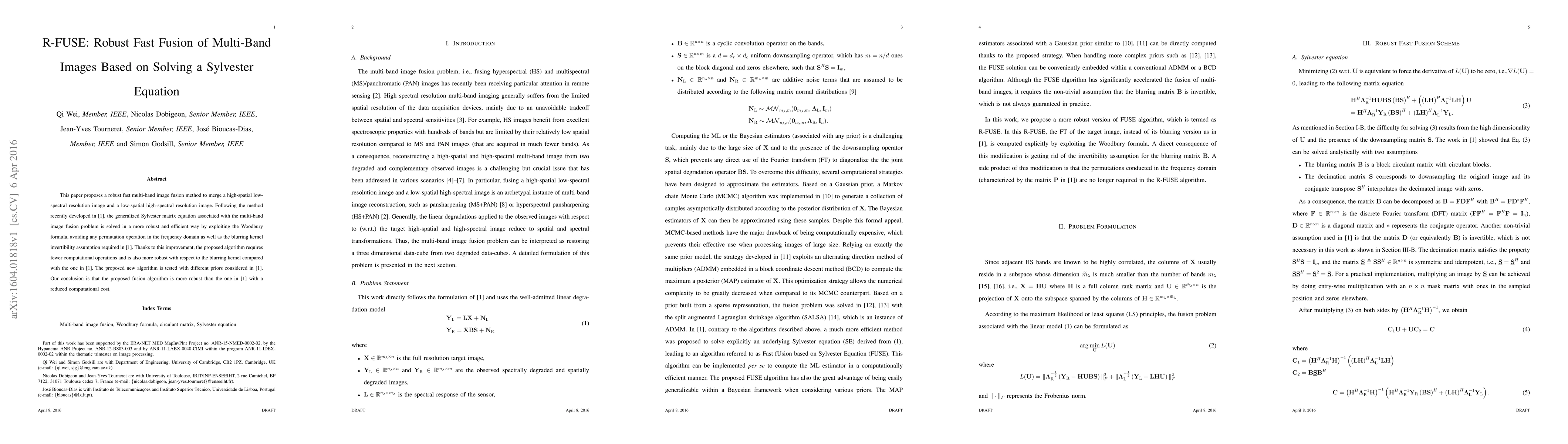 Title: R-FUSE: Robust Fast Fusion of Multi-Band Images Based on Solving a Sylvester Equation Summary: This paper introduces a robust and efficient method for fusing multi-band images by solving a generalized Sylvester matrix equation using the Woodbury formula, achieving reduced computational cost and enhanced robustness compared to previous methods.