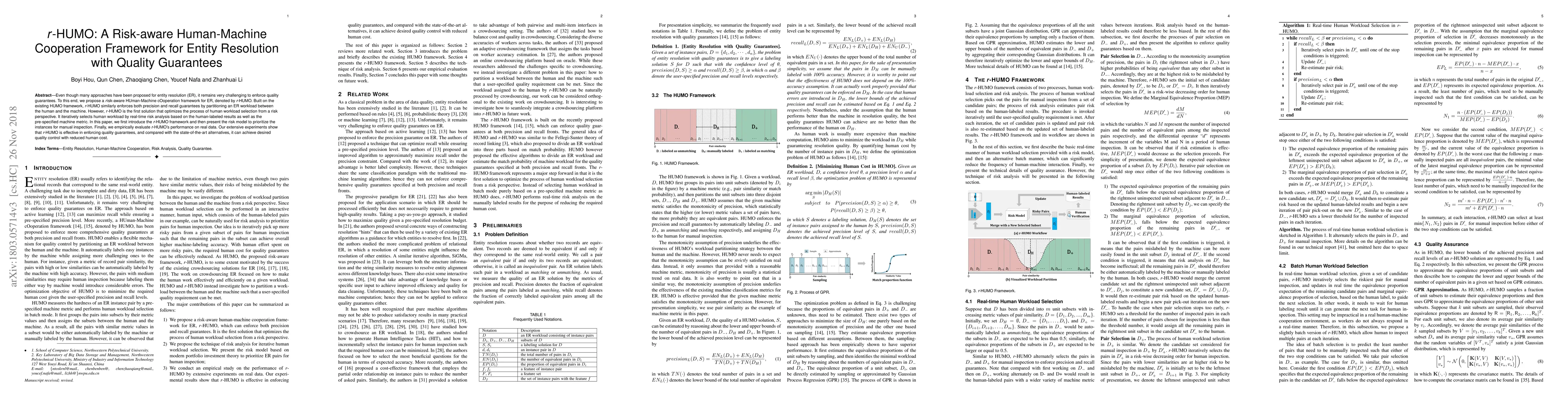The paper proposes r-HUMO, a risk-aware human-machine cooperation framework for entity resolution that optimizes human workload selection based on real-time risk analysis. Experimental results show that r-HUMO achieves better quality control with reduced human effort compared to state-of-the-art alternatives.