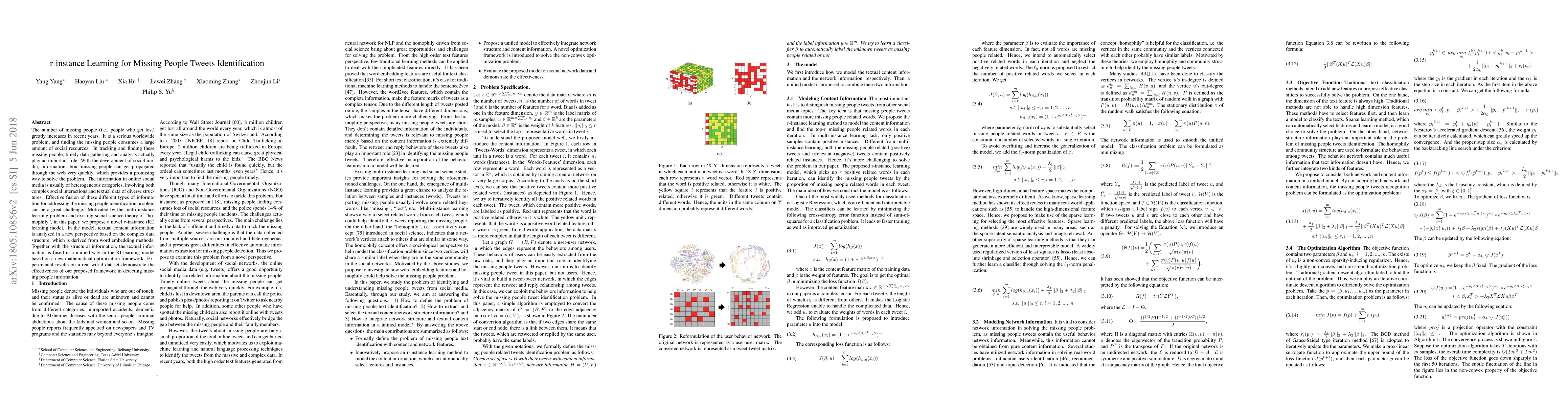 The number of missing people (i.e., people who get lost) greatly increases in recent years. It is a serious worldwide problem, and finding the missing people consumes a large amount of social resources. In tracking and finding these missing people, timely data gathering and analysis actually play an important role. With the development of social media, information about missing people can get propagated through the web very quickly, which provides a promising way to solve the problem. The information in online social media is usually of heterogeneous categories, involving both complex social interactions and textual data of diverse structures. Effective fusion of these different types of information for addressing the missing people identification problem can be a great challenge. Motivated by the multi-instance learning problem and existing social science theory of "homophily", in this paper, we propose a novel r-instance (RI) learning model.