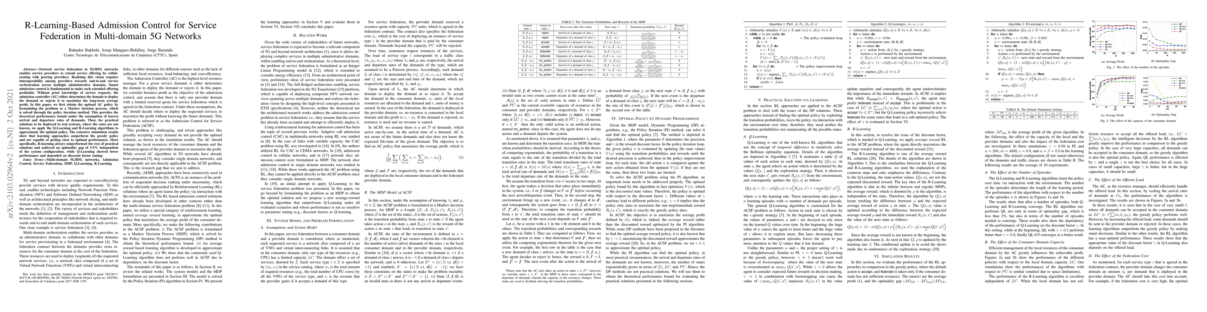 This paper proposes an R-Learning based admission control method for service federation in multi-domain 5G networks. It optimizes admission control using a Markov decision process and applies Q-Learning and R-Learning algorithms to approximate the optimal policy, demonstrating superior performance over greedy methods with R-Learning maintaining a consistent optimality gap.