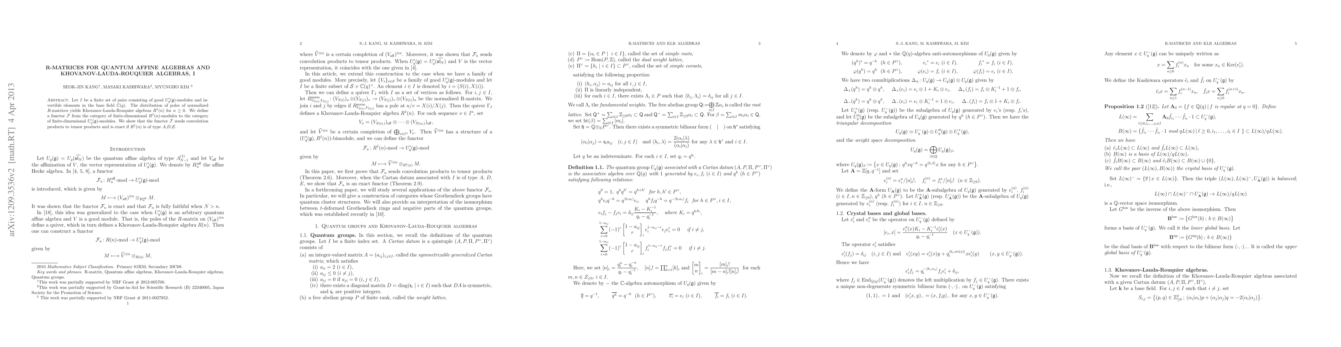 Let us consider a finite set of pairs consisting of good $U'_q(g)$-modules and invertible elements. The distribution of poles of normalized R-matrices yields Khovanov-Lauda-Rouquier algebras We define a functor from the category of finite-dimensional modules over the KLR algebra to the category of finite-dimensional $U_q'(g)$-modules. We show that the functor sends convolution products to tensor products and is exact if the KLR albera is of type A, D, E.