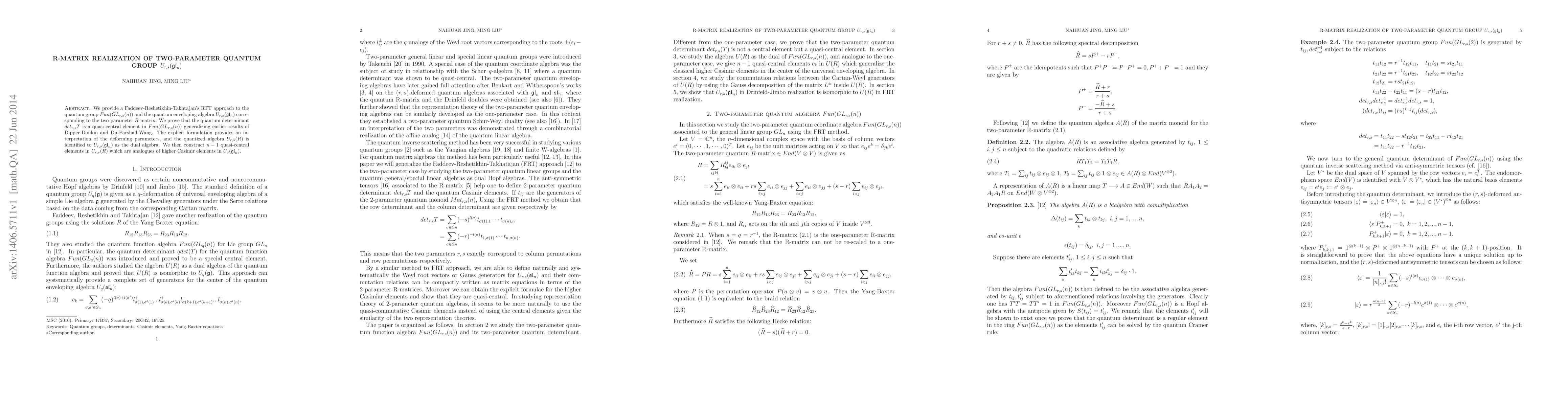 We provide a Faddeev-Reshetikhin-Takhtajan's RTT approach to the quantum group Fun(GL_{r,s}(n)) and the quantum enveloping algebra U_{r,s}(gl_n) corresponding to the two-parameter R-matrix. We prove that the quantum determinant det_{r,s}T is a quasi-central element in Fun(GL_{r,s}(n)) generalizing earlier results of Dipper-Donkin and Du-Parshall-Wang. The explicit formulation provides an interpretation of the deforming parameters, and the quantized algebra U_{r,s}(R) is identified to U_{r,s}(gl_n) as the dual algebra. We then construct n-1 quasi-central elements in U_{r,s}(R) which are analogues of higher Casimir elements in U_q(gl_n).