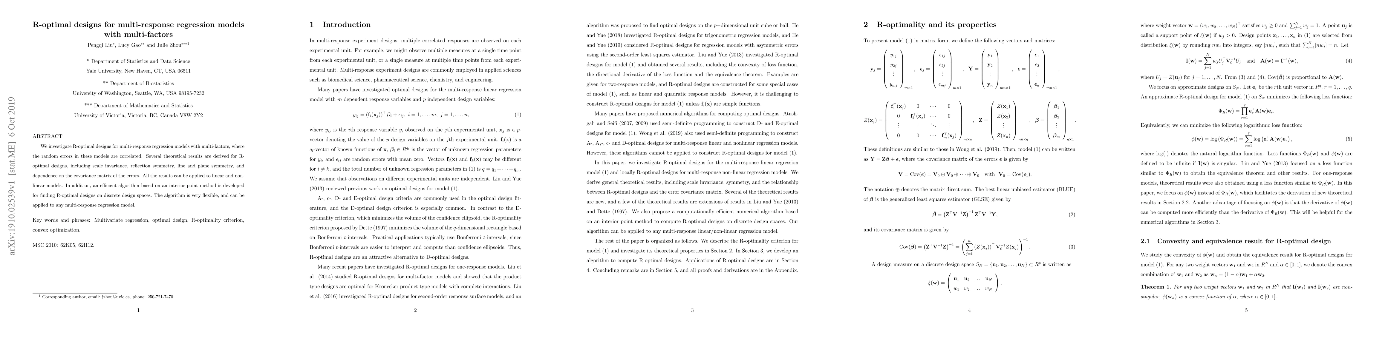 We investigate R-optimal designs for multi-response regression models with multi-factors, where the random errors in these models are correlated. Several theoretical results are derived for Roptimal designs, including scale invariance, reflection symmetry, line and plane symmetry, and dependence on the covariance matrix of the errors. All the results can be applied to linear and nonlinear models. In addition, an efficient algorithm based on an interior point method is developed for finding R-optimal designs on discrete design spaces. The algorithm is very flexible, and can be applied to any multi-response regression model.
