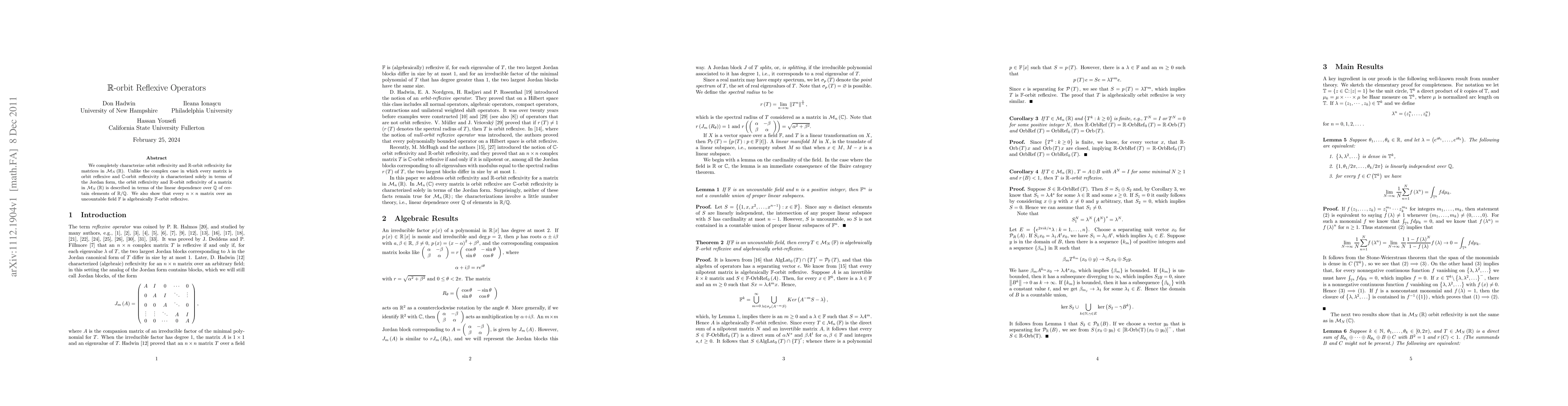 We completely characterize orbit reflexivity and R-orbit reflexivity for square matrices over the real numbers. Unlike the complex case in which every matrix is orbit reflexive and C-orbit reflexivity is characterized solely in terms of the Jordan form, the orbit reflexivity and R-orbit reflexivity of a real matrix is described in terms of the linear dependence over Q of certain elements of R/Q. We also show that every n-by-n matrix over an uncountable field F is algebraically F-orbit reflexive.