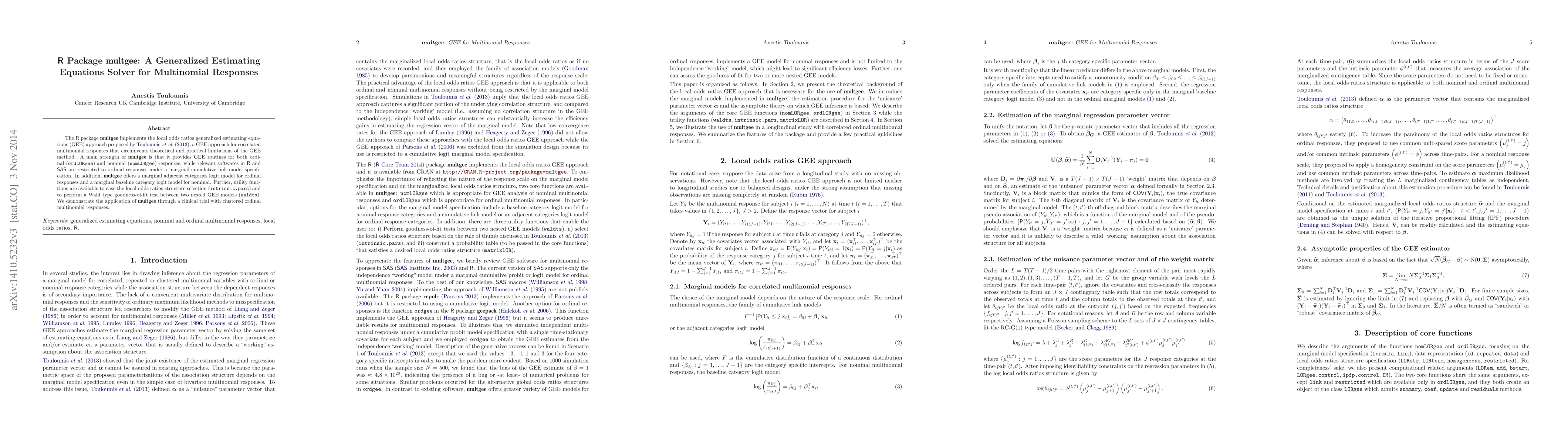 The R package multgee implements the local odds ratios generalized estimating equations (GEE) approach proposed by Touloumis et al. (2013), a GEE approach for correlated multinomial responses that circumvents theoretical and practical limitations of the GEE method. A main strength of multgee is that it provides GEE routines for both ordinal (ordLORgee) and nominal (nomLORgee) responses, while relevant softwares in R and SAS are restricted to ordinal responses under a marginal cumulative link model specification. In addition, multgee offers a marginal adjacent categories logit model for ordinal responses and a marginal baseline category logit model for nominal. Further, utility functions are available to ease the local odds ratios structure selection (intrinsic.pars) and to perform a Wald type goodness-of-fit test between two nested GEE models (waldts). We demonstrate the application of multgee through a clinical trial with clustered ordinal multinomial responses.