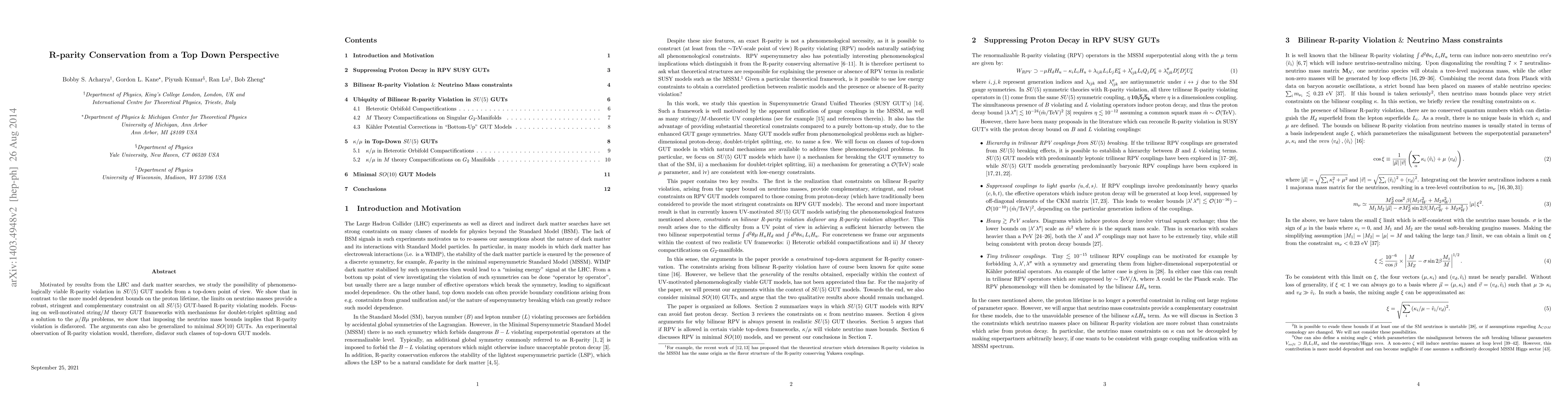 Motivated by results from the LHC and dark matter searches, we study the possibility of phenomenologically viable R-parity violation in $SU(5)$ GUT models from a top-down point of view. We show that in contrast to the more model dependent bounds on the proton lifetime, the limits on neutrino masses provide a robust, stringent and complementary constraint on all $SU(5)$ GUT-based R-parity violating models. Focusing on well-motivated string/$M$ theory GUT frameworks with mechanisms for doublet-triplet splitting and a solution to the $\mu/B\mu$ problems, we show that imposing the neutrino mass bounds implies that R-parity violation is disfavored. The arguments can also be generalized to minimal $SO(10)$ GUTs. An experimental observation of R-parity violation would, therefore, disfavor such classes of top-down GUT models.