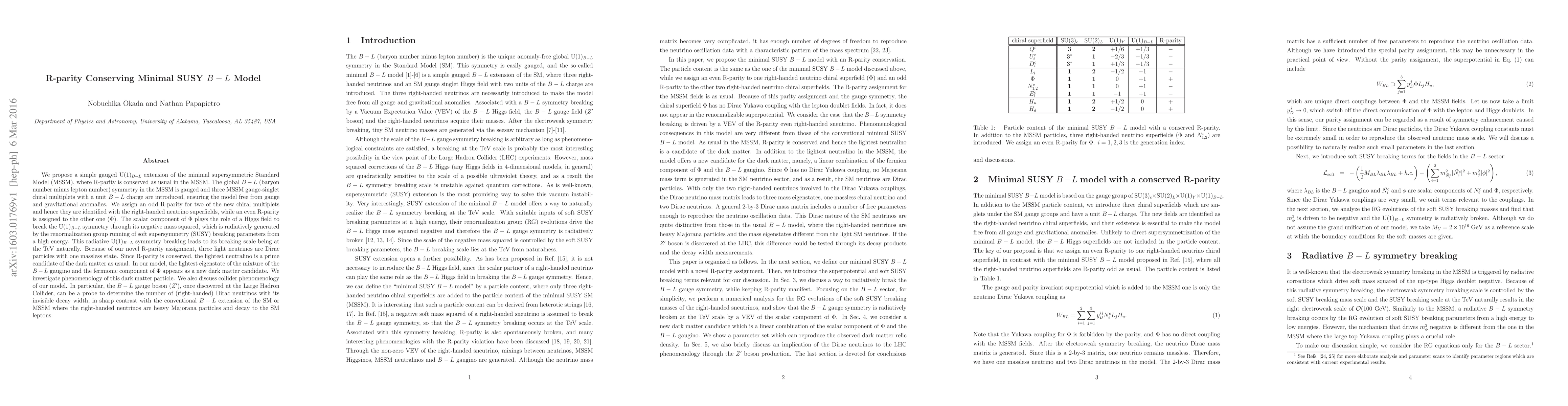We propose a simple gauged U(1)$_{B-L}$ extension of the minimal supersymmetric Standard Model (MSSM), where R-parity is conserved as usual in the MSSM. The global $B-L$ (baryon number minus lepton number) symmetry in the MSSM is gauged and three MSSM gauge-singlet chiral multiplets with a unit $B-L$ charge are introduced, ensuring the model free from gauge and gravitational anomalies. We assign an odd R-parity for two of the new chiral multiplets and hence they are identified with the right-handed neutrino superfields, while an even R-parity is assigned to the other one ($\Phi$). The scalar component of $\Phi$ plays the role of a Higgs field to break the U(1)$_{B-L}$ symmetry through its negative mass squared, which is radiatively generated by the renormalization group running of soft supersymmetry (SUSY) breaking parameters from a high energy. This radiative U(1)$_{B-L}$ symmetry breaking leads to its breaking scale being at the TeV naturally. Because of our novel R-parity assignment, three light neutrinos are Dirac particles with one massless state. Since R-parity is conserved, the lightest neutralino is a prime candidate of the dark matter as usual. In our model, the lightest eigenstate of the mixture of the $B-L$ gaugino and the fermionic component of $\Phi$ appears as a new dark matter candidate. We investigate phenomenology of this dark matter particle. We also discuss collider phenomenology of our model. In particular, the $B-L$ gauge boson ($Z'$), once discovered at the Large Hadron Collider, can be a probe to determine the number of (right-handed) Dirac neutrinos with its invisible decay width, in sharp contrast with the conventional $B-L$ extension of the SM or MSSM where the right-handed neutrinos are heavy Majorana particles and decay to the SM leptons.