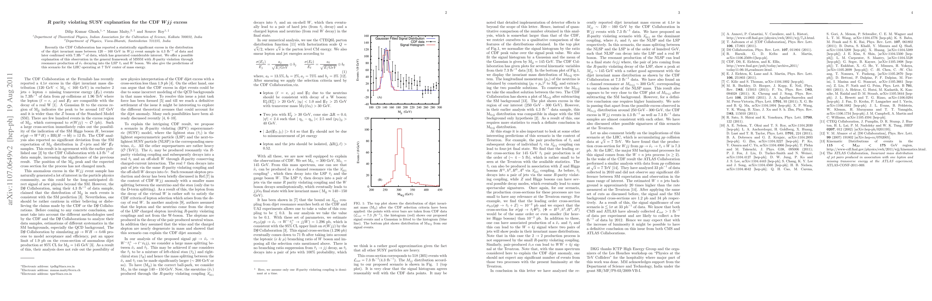 Recently CDF has reported a 4.1 sigma excess in the distribution of the dijet invariant mass between 120-160 GeV in Wjj event sample in 7.3 fb^{-1} of data, which has generated considerable interest. We offer a possible explanation of this observation in the general framework of MSSM with R-parity violation through resonance production of tau sneutrino decaying into the LSP stau_1 and W boson. We also give the predictions of this scenario for the LHC operating at 7 TeV center of mass energy.