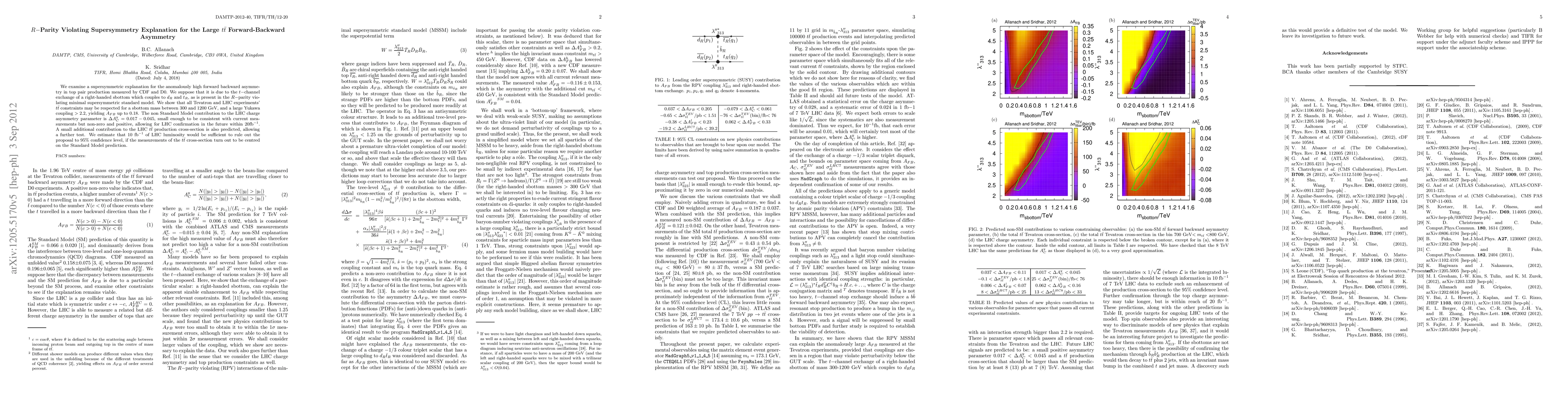 We propose a supersymmetric explanation for the anomalously high forward backward asymmetry in top pair production measured by CDF and D0. We suppose that it is due to the t-channel exchange of a right-handed sbottom which couples to d_R and t_R, as is present in the R-parity violating minimal supersymmetric standard model. We show that all Tevatron and LHC experiments' t tbar constraints may be respected for a sbottom mass between 300 and 1200 GeV, and a large Yukawa coupling >2.2, yielding A_{FB} up to 0.18. The non Standard Model contribution to the LHC charge asymmetry parameter is Delta A_C^y=0.017-0.045, small enough to be consistent with current measurements but non-zero and positive, allowing for LHC confirmation in the future within 20 fb^-1. A small additional contribution to the LHC t tbar production cross-section is also predicted, allowing a further test. We estimate that 10 fb^-1 of LHC luminosity would be sufficient to rule out the proposal to 95% confidence level, if the measurements of the t tbar cross-section turn out to be centred on the Standard Model prediction.