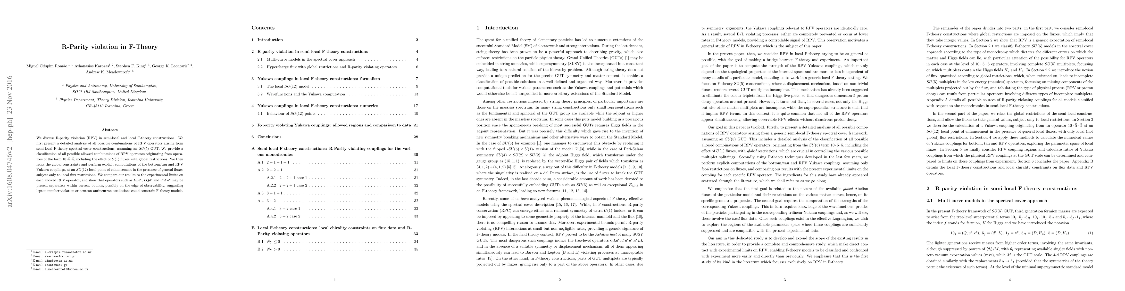 We discuss R-parity violation (RPV) in semi-local and local F-theory constructions. We first present a detailed analysis of all possible combinations of RPV operators arising from semi-local F-theory spectral cover constructions, assuming an $SU(5)$ GUT. We provide a classification of all possible allowed combinations of RPV operators originating from operators of the form $10\cdot \bar 5\cdot \bar 5$, including the effect of $U(1)$ fluxes with global restrictions. We then relax the global constraints and perform explicit computations of the bottom/tau and RPV Yukawa couplings, at an $SO(12)$ local point of enhancement in the presence of general fluxes subject only to local flux restrictions. We compare our results to the experimental limits on each allowed RPV operator, and show that operators such as $LLe^c$, $LQd^c$ and $u^cd^cd^c$ may be present separately within current bounds, possibly on the edge of observability, suggesting lepton number violation or neutron-antineutron oscillations could constrain F-theory models.