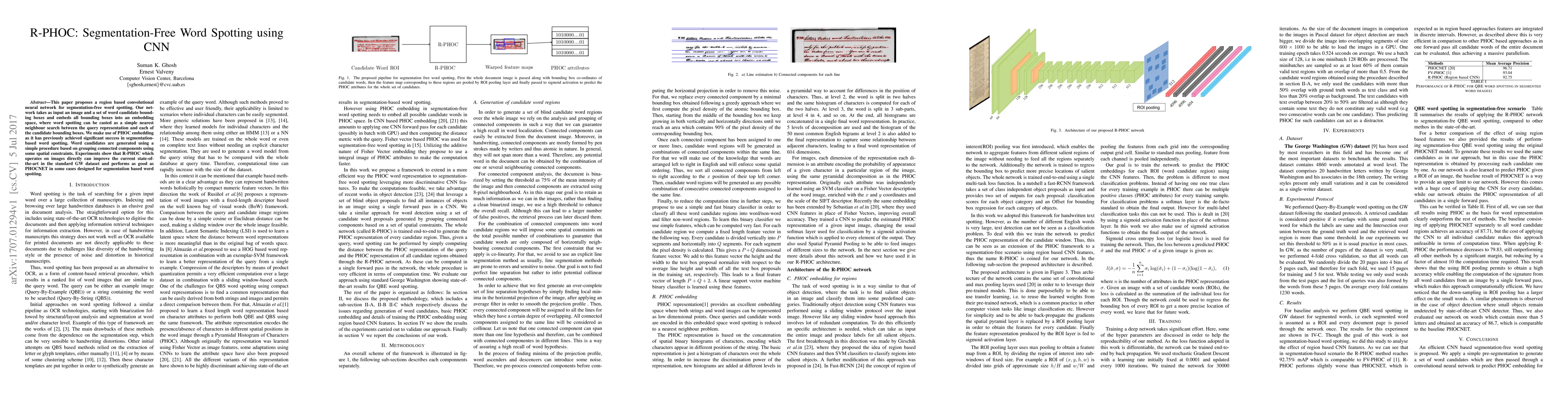 This paper introduces R-PHOC, a segmentation-free word spotting method using CNNs, which embeds word candidate bounding boxes into a space for nearest neighbor search. It outperforms current state-of-the-art on the GW dataset and matches PHOCNET's performance in segmentation-based word spotting.