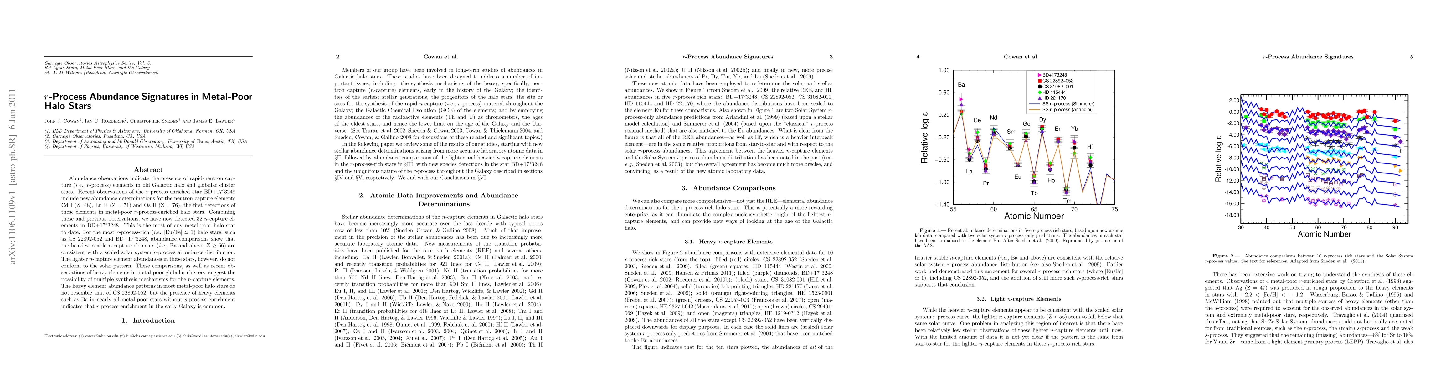 This paper investigates the abundance of r-process elements in metal-poor halo stars, finding that stars like BD +17 3248 exhibit the highest number of neutron-capture elements detected to date. The heaviest elements conform to a scaled solar r-process distribution, while lighter elements do not, suggesting multiple r-process mechanisms.
