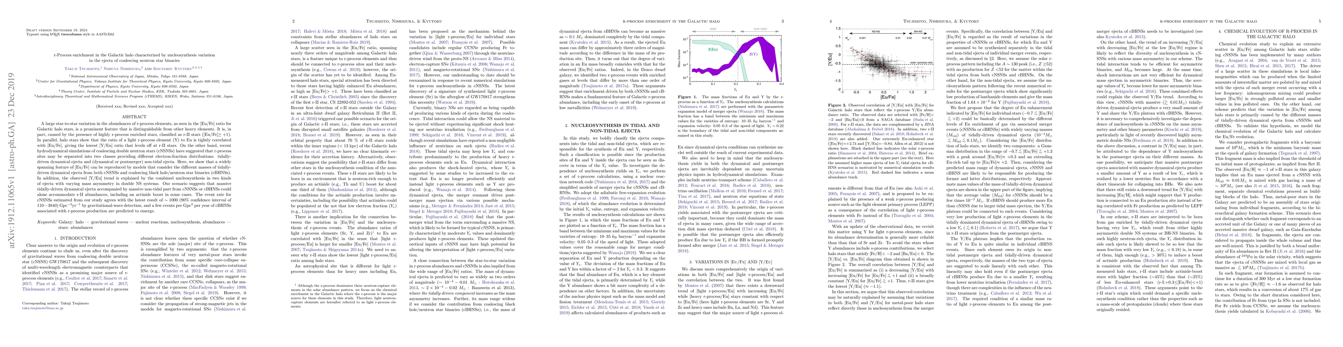 A large star-to-star variation in the abundances of r-process elements, as seen in the [Eu/Fe] ratio for Galactic halo stars, is a prominent feature that is distinguishable from other heavy elements. It is, in part, caused by the presence of highly r-process enriched stars, classified as r-II stars ([Eu/Fe]>+1). In parallel, halo stars show that the ratio of a light r-process element (Y) to Eu is tightly correlated with [Eu/Fe], giving the lowest [Y/Eu] ratio that levels off at r-II stars. On the other hand, recent hydrodynamical simulations of coalescing double neutron stars (cNSNSs) have suggested that r-process sites may be separated into two classes providing different electron-fraction distributions: tidally-driven dynamical ejecta and (dynamical or postmerger) non-tidal ejecta. Here, we show that a widely spanning feature of [Eu/Fe] can be reproduced by models that consider the different masses of tidally-driven dynamical ejecta from both cNSNSs and coalescing black hole/neutron star binaries (cBHNSs). In addition, the observed [Y/Eu] trend is explained by the combined nucleosynthesis in two kinds of ejecta with varying mass asymmetry in double NS systems. Our scenario suggests that massive tidally-driven dynamical ejecta accompanied by massive non-tidal part from cNSNSs or cBHNSs could alone accommodate r-II abundances, including an actinide boost in some cases. The event rate for cNSNSs estimated from our study agrees with the latest result of ~1000 (90% confidence interval of 110-3840) Gpc$^{-3}$yr$^{-1}$ by gravitational-wave detection, and a few events per Gpc$^3$ per year of cBHNSs associated with r-process production are predicted to emerge.