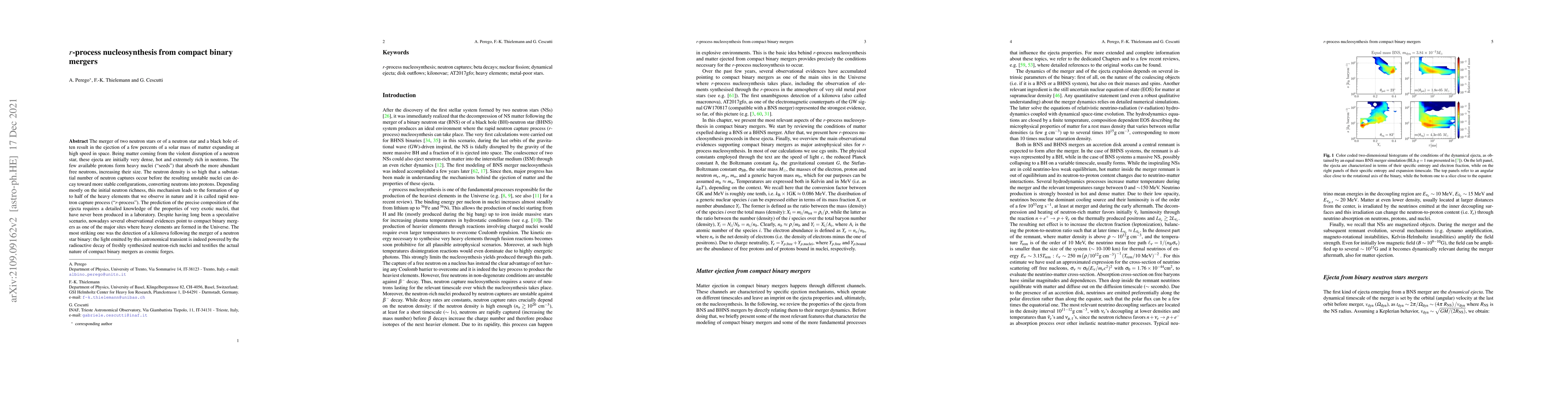 This paper explores the $r$-process nucleosynthesis occurring in compact binary mergers, where neutron-rich ejecta from neutron star or neutron star-black hole collisions lead to the formation of up to half of the heavy elements in the universe through rapid neutron capture processes. Observational evidence, including the detection of a kilonova, supports these mergers as significant sites for heavy element production.