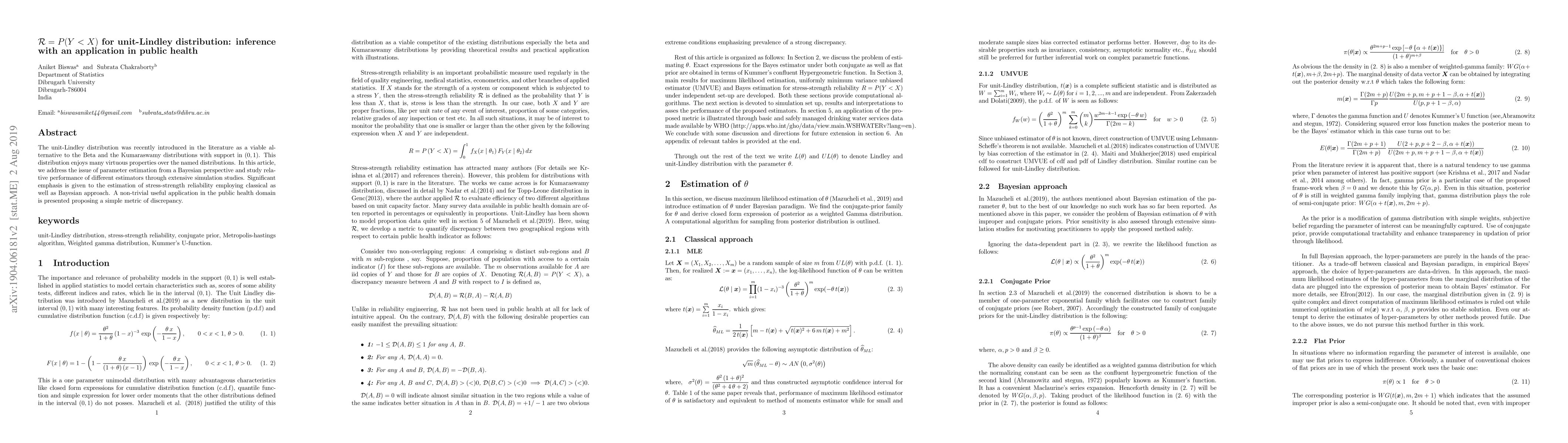 This paper introduces the unit-Lindley distribution as an alternative to Beta and Kumaraswamy distributions, focusing on Bayesian parameter estimation and simulation studies. It also explores stress-strength reliability and applies the findings to a public health metric of discrepancy.