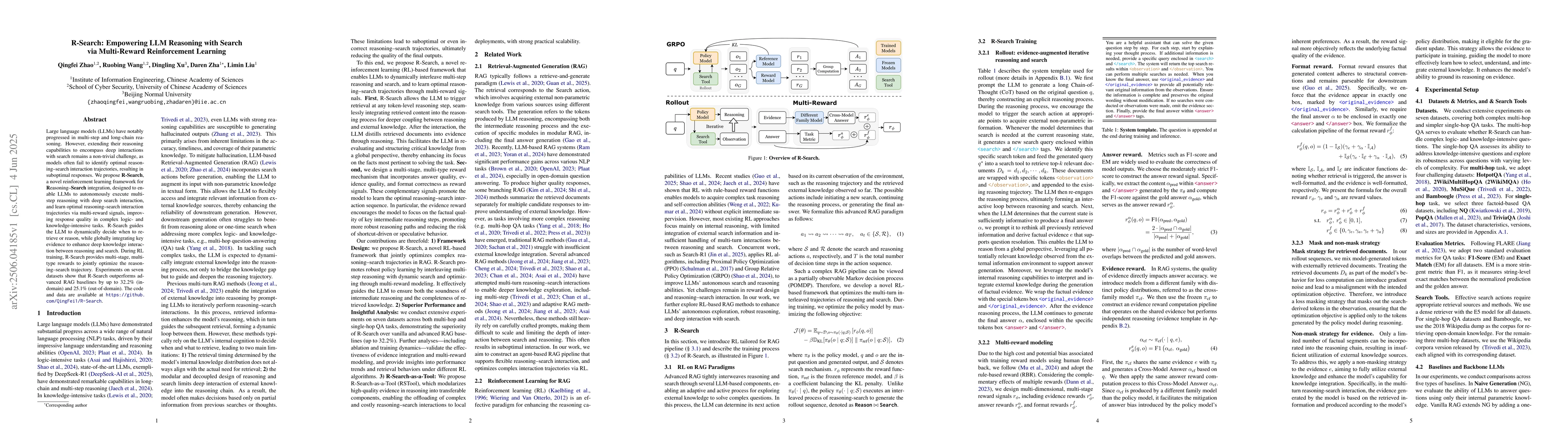R-Search improves large language models' reasoning capabilities by integrating search via multi-reward reinforcement learning, achieving up to 32.2% gains in complex logic and knowledge-intensive tasks.