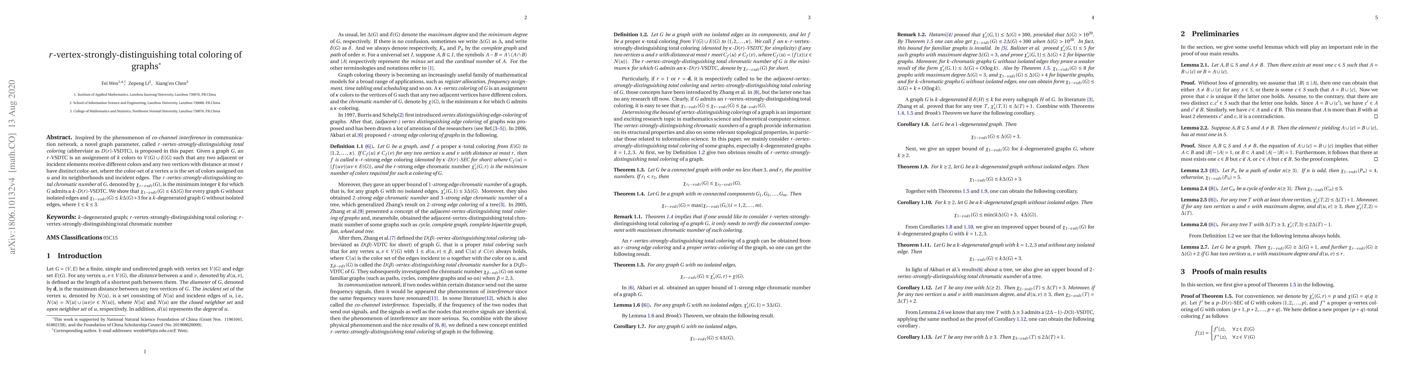 This paper introduces a new graph coloring concept called $r$-vertex-strongly-distinguishing total coloring (D(r)-VSDTC), inspired by co-channel interference in communication networks. The $r$-VSDTC assigns colors to vertices and edges such that adjacent elements differ in color and vertices within distance $r$ have distinct color sets. The paper establishes bounds for the $r$-vertex-strongly-distinguishing total chromatic number, $\chi_{r-vsdt}(G)$, showing $\chi_{1-vsdt}(G)\leq 4\Delta(G)$ for general graphs and $\chi_{1-vsdt}(G)\le k\Delta(G)+3$ for $k$-degenerated graphs.