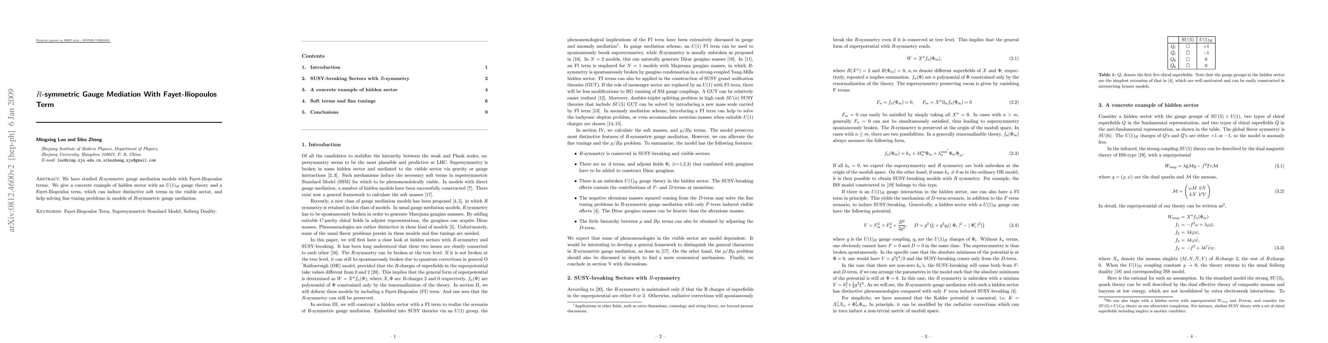 We have studied $R$-symmetrc gauge mediation models with Fayet-Iliopoulos terms. We give a concrete example of hidden sector with an $U(1)_H$ gauge theory and a Fayet-Iliopoulos term, which can induce distinctive soft terms in the visible sector, and help solving fine tuning problems in models of $R$-symmetric gauge mediation.