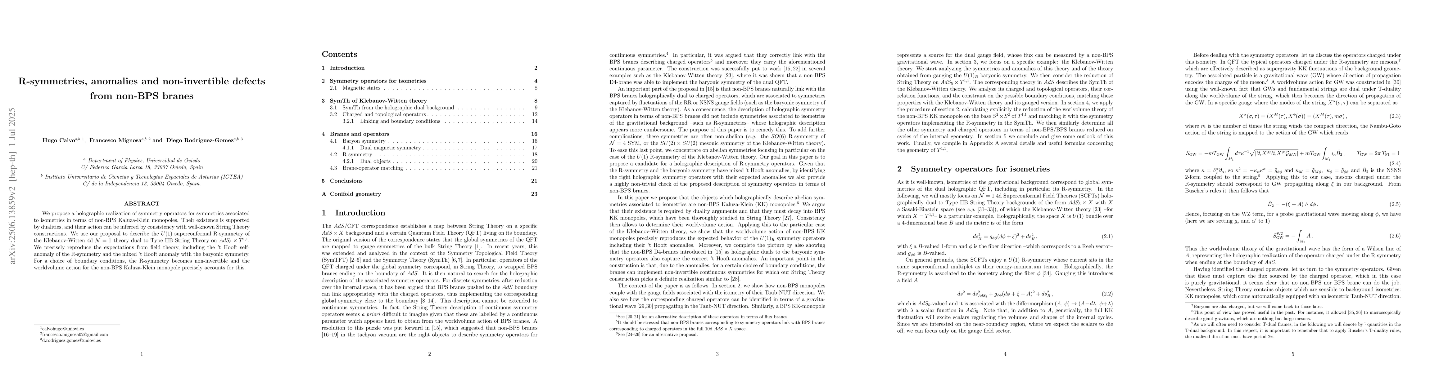 We propose a holographic realization of symmetry operators for symmetries associated to isometries in terms of non-BPS Kaluza-Klein monopoles. Their existence is supported by dualities, and their action can be inferred by consistency with well-known String Theory constructions. We use our proposal to describe the $U(1)$ superconformal R-symmetry of the Klebanov-Witten 4d $\mathcal{N}=1$ theory dual to Type IIB String Theory on $AdS_5\times T^{1,1}$. We precisely reproduce the expectations from field theory, including the 't Hooft self-anomaly of the R-symmetry and the mixed 't Hooft anomaly with the baryonic symmetry. For a choice of boundary conditions, the R-symmetry becomes non-invertible and the worldvolume action for the non-BPS Kaluza-Klein monopole precisely accounts for this.