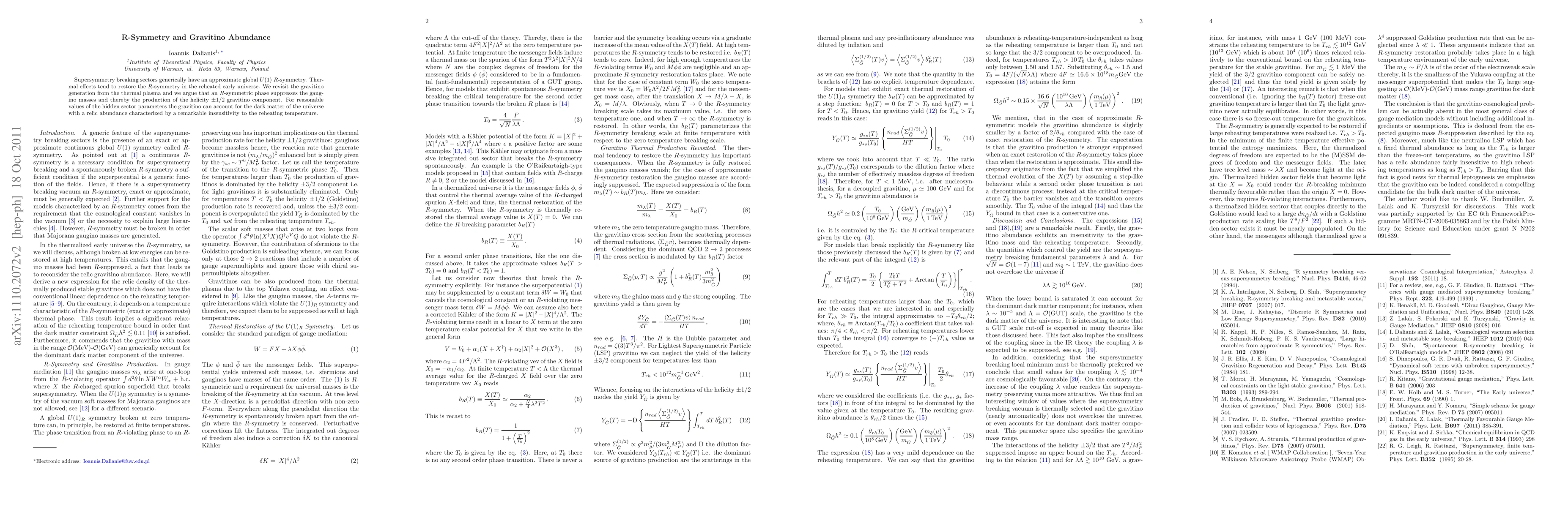 This paper discusses how an $R$-symmetric phase in the early universe suppresses gravitino production, leading to a gravitino abundance that is remarkably insensitive to the reheating temperature, potentially explaining dark matter. The suppression of gaugino masses in this phase is key to the gravitino's role in dark matter.
