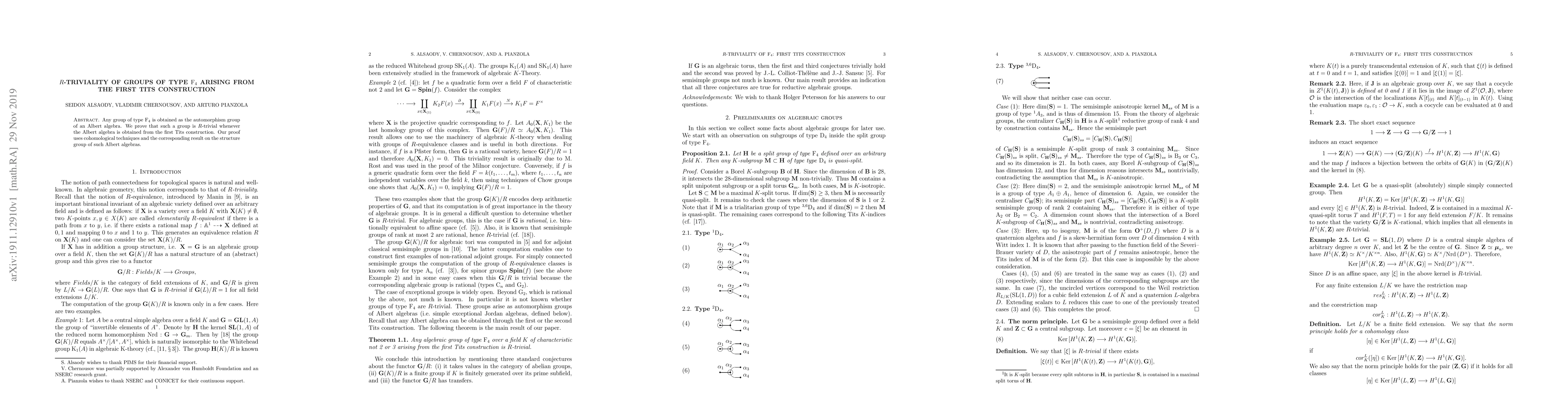 The paper presents a proof of $R$-triviality for specific groups of type ${ m F}_4$ using cohomological methods and properties of Albert algebras from the first Tits construction.