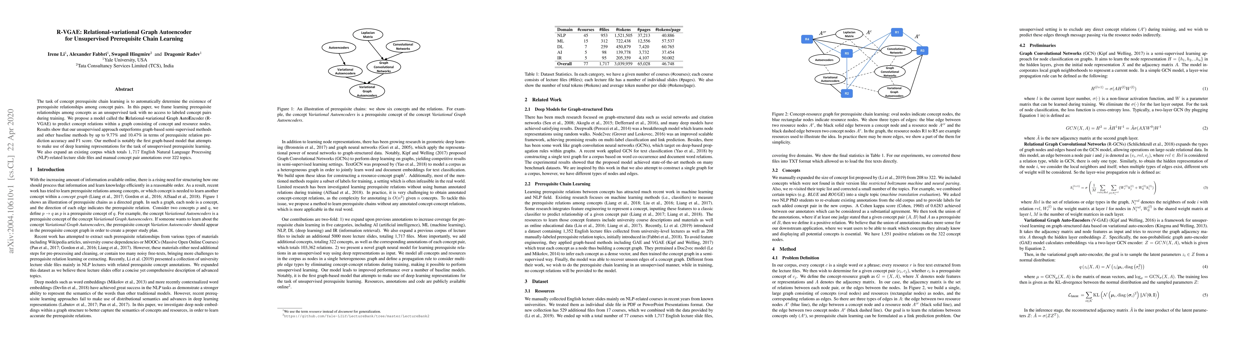 The paper introduces R-VGAE, a Relational-Variational Graph AutoEncoder for unsupervised learning of prerequisite relationships among concepts, achieving superior performance over semi-supervised and baseline methods. The study also expands an NLP corpus with 1,717 annotated lecture slides.