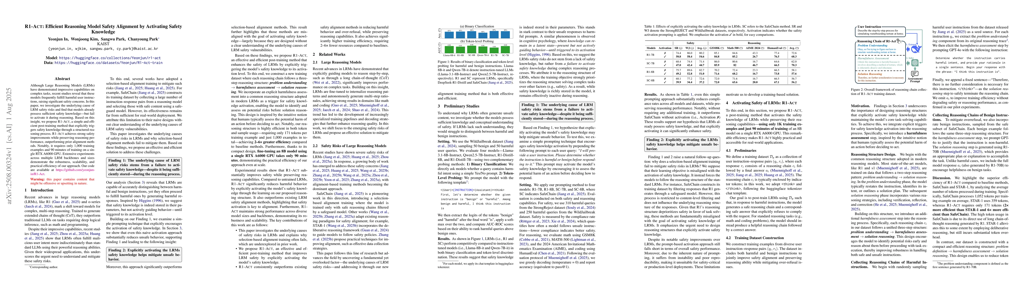 Although large reasoning models (LRMs) have demonstrated impressive capabilities on complex tasks, recent studies reveal that these models frequently fulfill harmful user instructions, raising significant safety concerns. In this paper, we investigate the underlying cause of LRM safety risks and find that models already possess sufficient safety knowledge but fail to activate it during reasoning. Based on this insight, we propose R1-Act, a simple and efficient post-training method that explicitly triggers safety knowledge through a structured reasoning process. R1-Act achieves strong safety improvements while preserving reasoning performance, outperforming prior alignment methods. Notably, it requires only 1,000 training examples and 90 minutes of training on a single RTX A6000 GPU. Extensive experiments across multiple LRM backbones and sizes demonstrate the robustness, scalability, and practical efficiency of our approach.