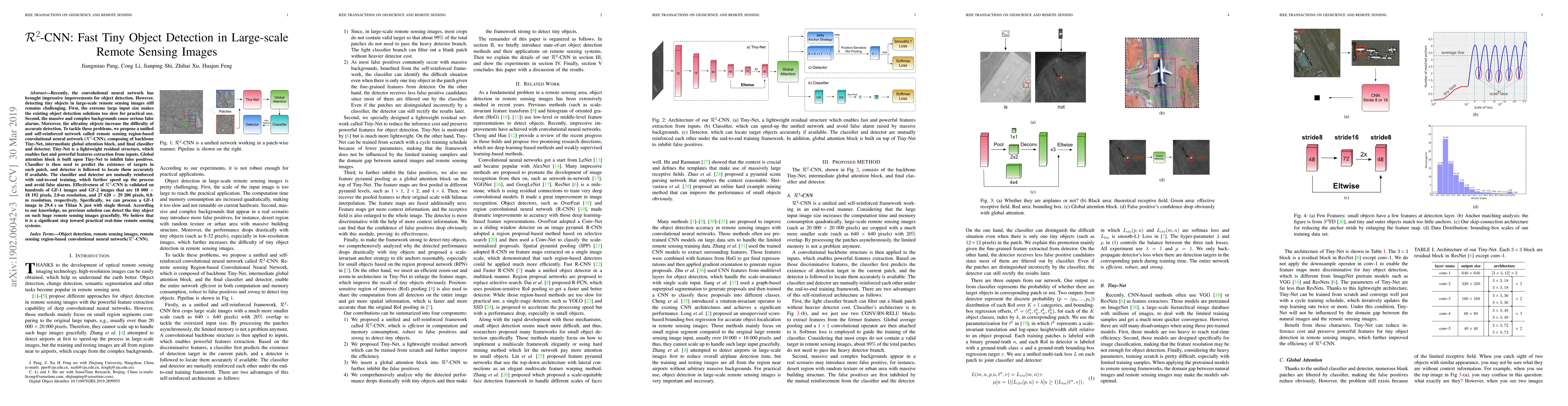 Recently, the convolutional neural network has brought impressive improvements for object detection. However, detecting tiny objects in large-scale remote sensing images still remains challenging. First, the extreme large input size makes the existing object detection solutions too slow for practical use. Second, the massive and complex backgrounds cause serious false alarms. Moreover, the ultratiny objects increase the difficulty of accurate detection. To tackle these problems, we propose a unified and self-reinforced network called remote sensing region-based convolutional neural network ($\mathcal{R}^2$-CNN), composing of backbone Tiny-Net, intermediate global attention block, and final classifier and detector. Tiny-Net is a lightweight residual structure, which enables fast and powerful features extraction from inputs. Global attention block is built upon Tiny-Net to inhibit false positives. Classifier is then used to predict the existence of targets in each patch, and detector is followed to locate them accurately if available. The classifier and detector are mutually reinforced with end-to-end training, which further speed up the process and avoid false alarms. Effectiveness of $\mathcal{R}^2$-CNN is validated on hundreds of GF-1 images and GF-2 images that are 18 000 $\times$ 18 192 pixels, 2.0-m resolution, and 27 620 $\times$ 29 200 pixels, 0.8-m resolution, respectively. Specifically, we can process a GF-1 image in 29.4 s on Titian X just with single thread. According to our knowledge, no previous solution can detect the tiny object on such huge remote sensing images gracefully. We believe that it is a significant step toward practical real-time remote sensing systems.