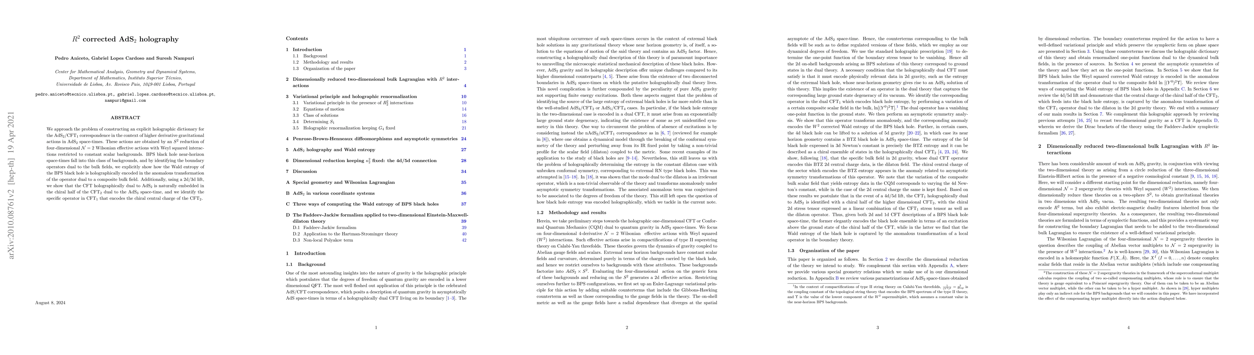 We approach the problem of constructing an explicit holographic dictionary for the AdS$_2$/CFT$_1$ correspondence in the context of higher derivative gravitational actions in AdS$_2$ space-times. These actions are obtained by an $S^2$ reduction of four-dimensional ${\cal N}=2$ Wilsonian effective actions with Weyl squared interactions restricted to constant scalar backgrounds. BPS black hole near-horizon space-times fall into this class of backgrounds, and by identifying the boundary operators dual to the bulk fields, we explicitly show how the Wald entropy of the BPS black hole is holographically encoded in the anomalous transformation of the operator dual to a composite bulk field. Additionally, using a 2d/3d lift, we show that the CFT holographically dual to AdS$_2$ is naturally embedded in the chiral half of the CFT$_2$ dual to the AdS$_3$ space-time, and we identify the specific operator in CFT$_1$ that encodes the chiral central charge of the CFT$_2$.