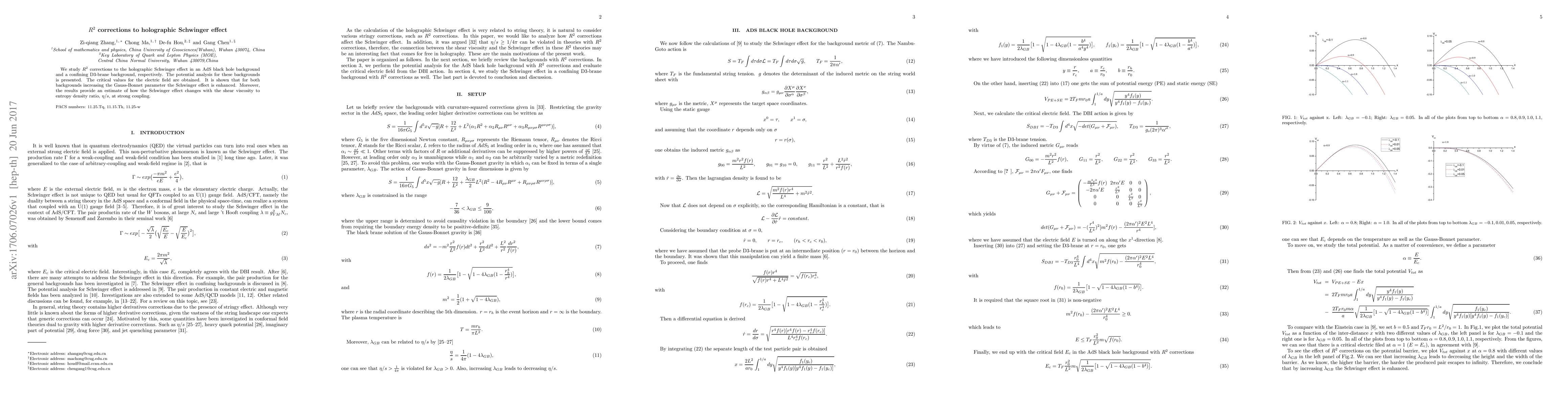 We study $R^2$ corrections to the holographic Schwinger effect in an AdS black hole background and a confining D3-brane background, respectively. The potential analysis for these backgrounds is presented. The critical values for the electric field are obtained. It is shown that for both backgrounds increasing the Gauss-Bonnet parameter the Schwinger effect is enhanced. Moreover, the results provide an estimate of how the Schwinger effect changes with the shear viscosity to entropy density ratio, $\eta/s$, at strong coupling.