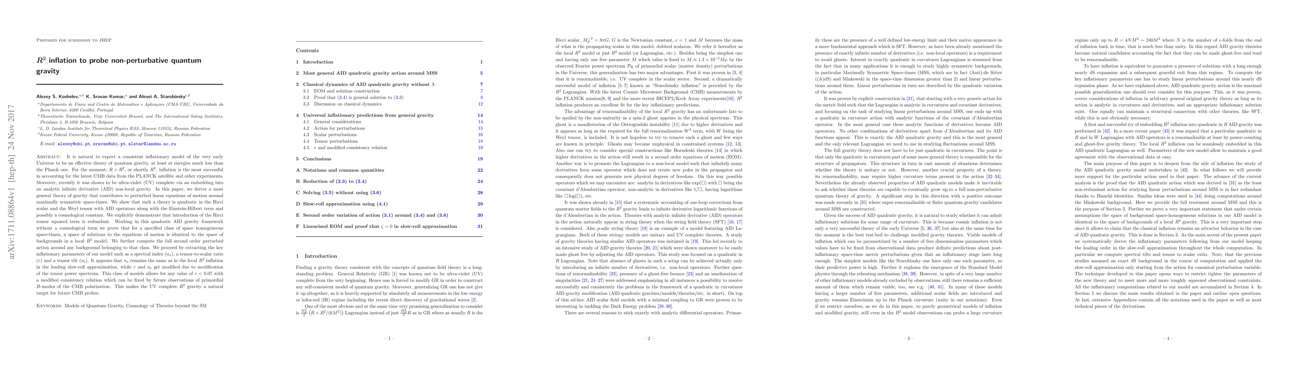 It is natural to expect a consistent inflationary model of the very early Universe to be an effective theory of quantum gravity, at least at energies much less than the Planck one. For the moment, $R+R^2$, or shortly $R^2$, inflation is the most successful in accounting for the latest CMB data from the PLANCK satellite and other experiments. Moreover, recently it was shown to be ultra-violet (UV) complete via an embedding into an analytic infinite derivative (AID) non-local gravity. In this paper, we derive a most general theory of gravity that contributes to perturbed linear equations of motion around maximally symmetric space-times. We show that such a theory is quadratic in the Ricci scalar and the Weyl tensor with AID operators along with the Einstein-Hilbert term and possibly a cosmological constant. We explicitly demonstrate that introduction of the Ricci tensor squared term is redundant. Working in this quadratic AID gravity framework without a cosmological term we prove that for a specified class of space homogeneous space-times, a space of solutions to the equations of motion is identical to the space of backgrounds in a local $R^2$ model. We further compute the full second order perturbed action around any background belonging to that class. We proceed by extracting the key inflationary parameters of our model such as a spectral index ($n_s$), a tensor-to-scalar ratio ($r$) and a tensor tilt ($n_t$). It appears that $n_s$ remains the same as in the local $R^2$ inflation in the leading slow-roll approximation, while $r$ and $n_t$ get modified due to modification of the tensor power spectrum. This class of models allows for any value of $r<0.07$ with a modified consistency relation which can be fixed by future observations of primordial $B$-modes of the CMB polarization. This makes the UV complete $R^2$ gravity a natural target for future CMB probes.