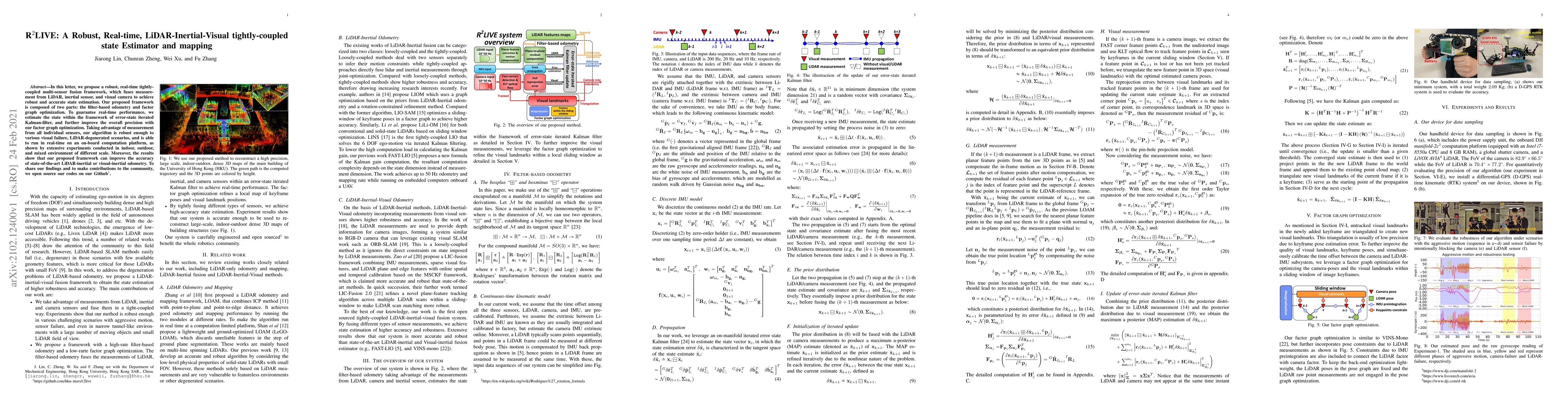 This paper introduces R2LIVE, a real-time, tightly-coupled multi-sensor fusion framework that integrates LiDAR, inertial, and visual data for robust state estimation. The framework combines an error-state Kalman filter with factor graph optimization to achieve high accuracy and real-time performance across various environments.