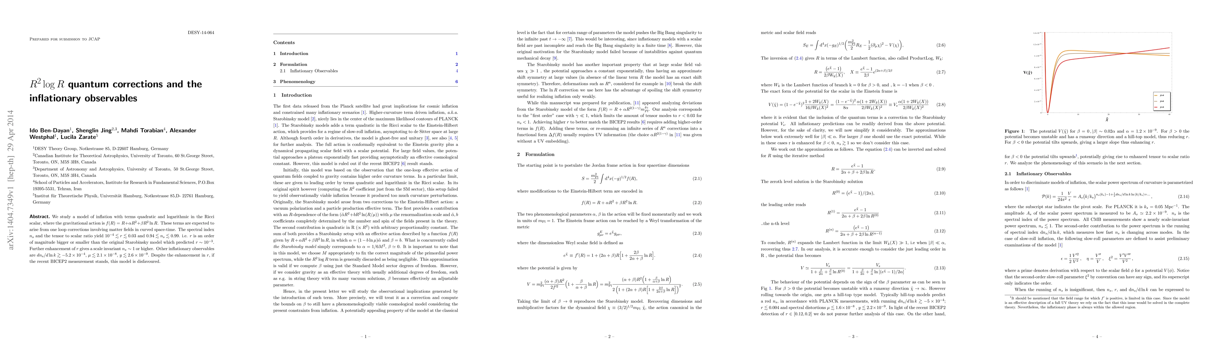 We study a model of inflation with terms quadratic and logarithmic in the Ricci scalar, where the gravitational action is $f(R)=R+\alpha R^2+\beta R^2 \ln R$. These terms are expected to arise from one loop corrections involving matter fields in curved space-time. The spectral index $n_s$ and the tensor to scalar ratio yield $10^{-4}\lesssim r\lesssim0.03$ and $0.94\lesssim n_s \lesssim 0.99$. i.e. $r$ is an order of magnitude bigger or smaller than the original Starobinsky model which predicted $r\sim 10^{-3}$. Further enhancement of $r$ gives a scale invariant $n_s\sim 1$ or higher. Other inflationary observables are $d n_s/d\ln k \gtrsim -5.2 \times 10^{-4},\, \mu \lesssim 2.1 \times 10^{-8} ,\, y \lesssim 2.6 \times 10^{-9}$. Despite the enhancement in $r$, if the recent BICEP2 measurement stands, this model is disfavoured.