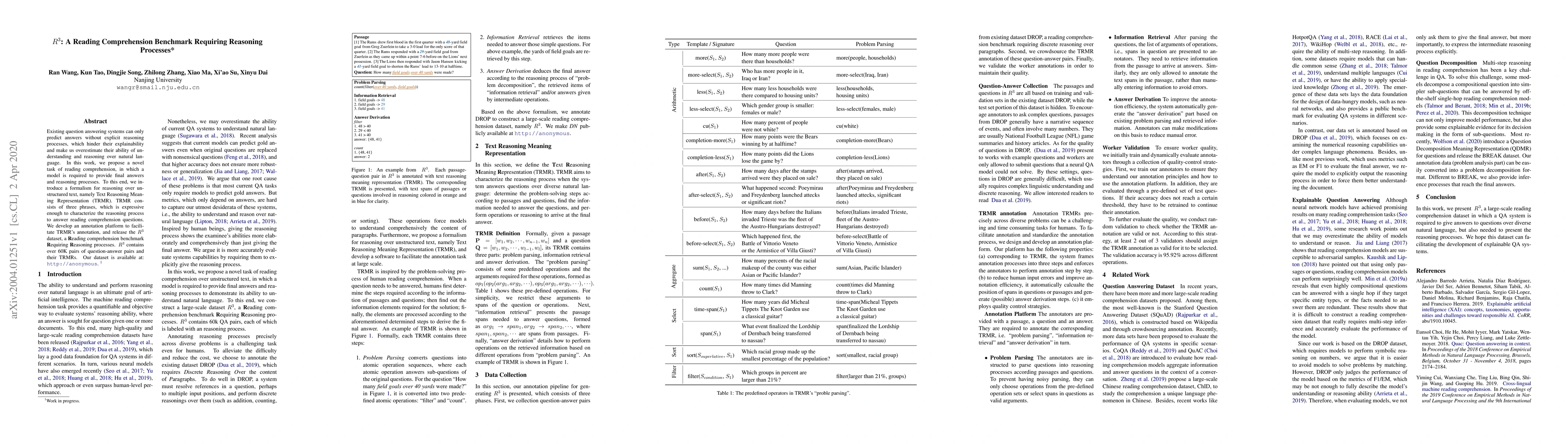 Existing question answering systems can only predict answers without explicit reasoning processes, which hinder their explainability and make us overestimate their ability of understanding and reasoning over natural language. In this work, we propose a novel task of reading comprehension, in which a model is required to provide final answers and reasoning processes. To this end, we introduce a formalism for reasoning over unstructured text, namely Text Reasoning Meaning Representation (TRMR). TRMR consists of three phrases, which is expressive enough to characterize the reasoning process to answer reading comprehension questions. We develop an annotation platform to facilitate TRMR's annotation, and release the R3 dataset, a \textbf{R}eading comprehension benchmark \textbf{R}equiring \textbf{R}easoning processes. R3 contains over 60K pairs of question-answer pairs and their TRMRs. Our dataset is available at: \url{http://anonymous}.