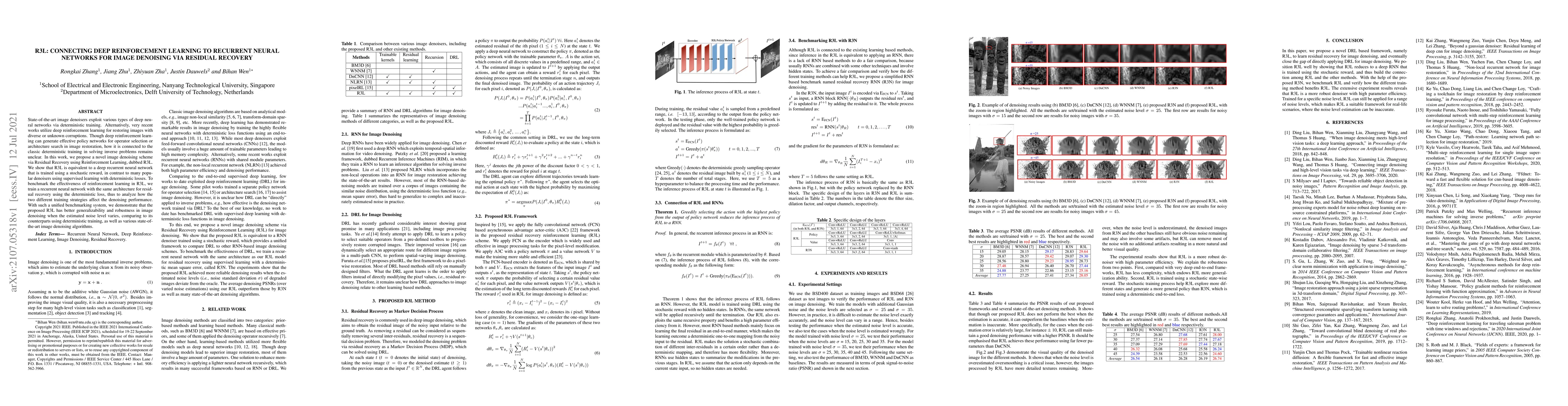 This paper proposes R3L, a novel image denoising method that connects deep reinforcement learning to recurrent neural networks for residual recovery. R3L demonstrates superior generalizability and robustness compared to traditional deterministic training methods, especially when noise levels vary.