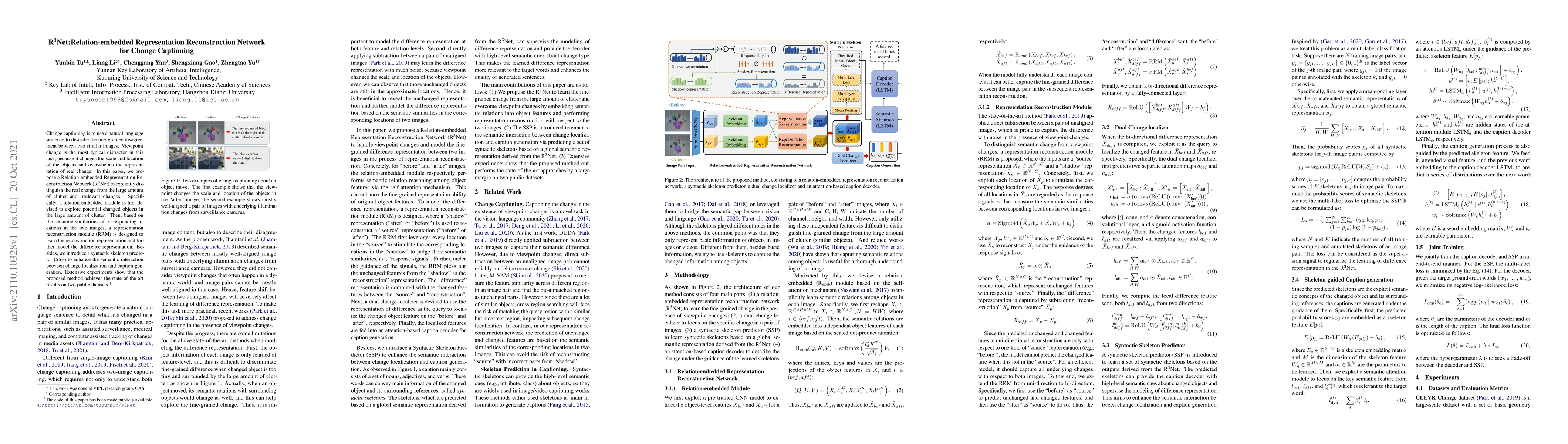 The paper proposes R$^3$Net for change captioning, which uses a relation-embedded module to identify potential changes and a representation reconstruction module to model differences between images. It also incorporates a syntactic skeleton predictor to enhance semantic interaction, achieving state-of-the-art results on two datasets.