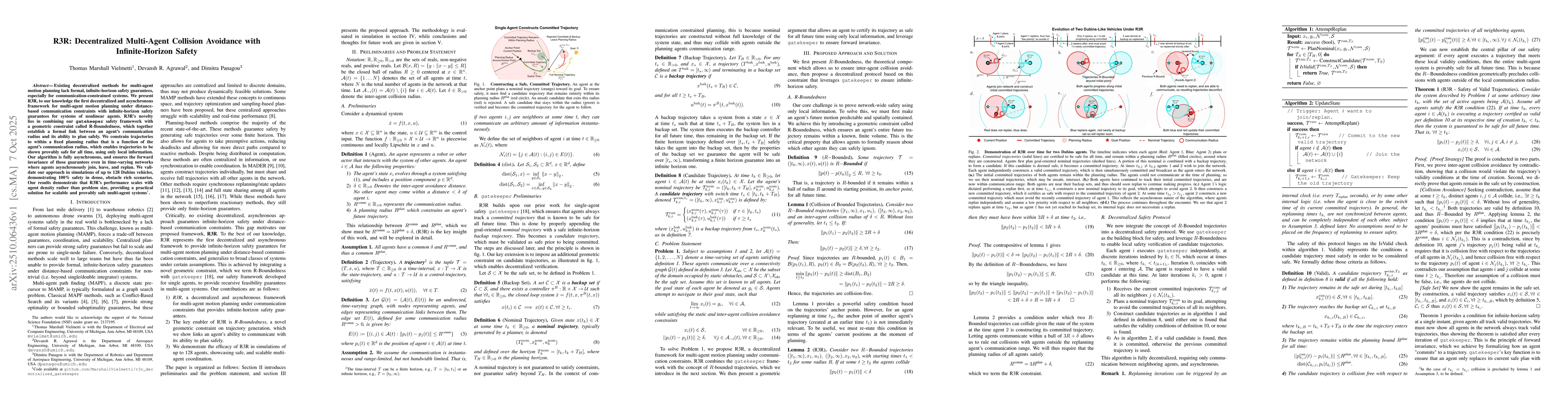 The research introduces R3R (Reachable Range and Communication Radius Relationship), a framework that establishes a formal geometric link between an agent's communication range and the range within which it can plan trajectories to ensure safety. It combines R-Bounded trajectories, which remain within a fixed radius of their starting point, with a gatekeeper mechanism to enforce valid trajectory tracking.