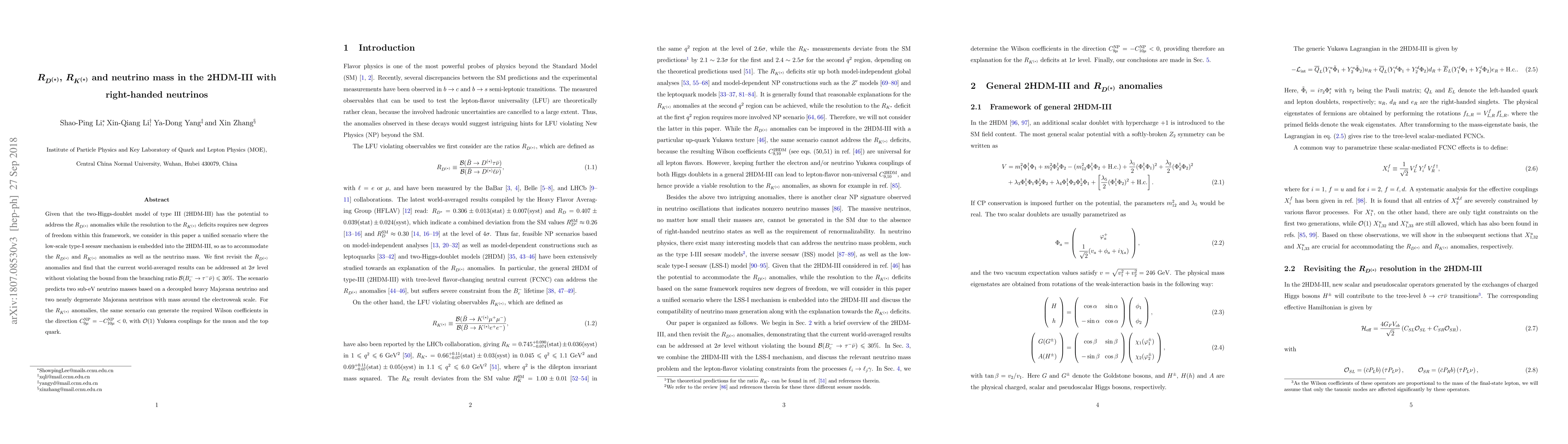 Given that the two-Higgs-doublet model of type III (2HDM-III) has the potential to address the $R_{D^{(\ast)}}$ anomalies while the resolution to the $R_{K^{(\ast)}}$ deficits requires new degrees of freedom within this framework, we consider in this paper a unified scenario where the low-scale type-I seesaw mechanism is embedded into the 2HDM-III, so as to accommodate the $R_{D^{(\ast)}}$ and $R_{K^{(\ast)}}$ anomalies as well as the neutrino mass. We first revisit the $R_{D^{(\ast)}}$ anomalies and find that the current world-averaged results can be addressed at $2\sigma$ level without violating the bound from the branching ratio $\mathcal{B}(B_c^-\rightarrow \tau^- \bar{\nu})\leqslant 30\%$. The scenario predicts two sub-eV neutrino masses based on a decoupled heavy Majorana neutrino and two nearly degenerate Majorana neutrinos with mass around the electroweak scale. For the $R_{K^{(\ast)}}$ anomalies, the same scenario can generate the required Wilson coefficients in the direction $ C_{9 \mu}^{\rm NP}=-C_{10 \mu}^{\rm NP}<0$, with $\mathcal{O}(1)$ Yukawa couplings for the muon and the top quark.