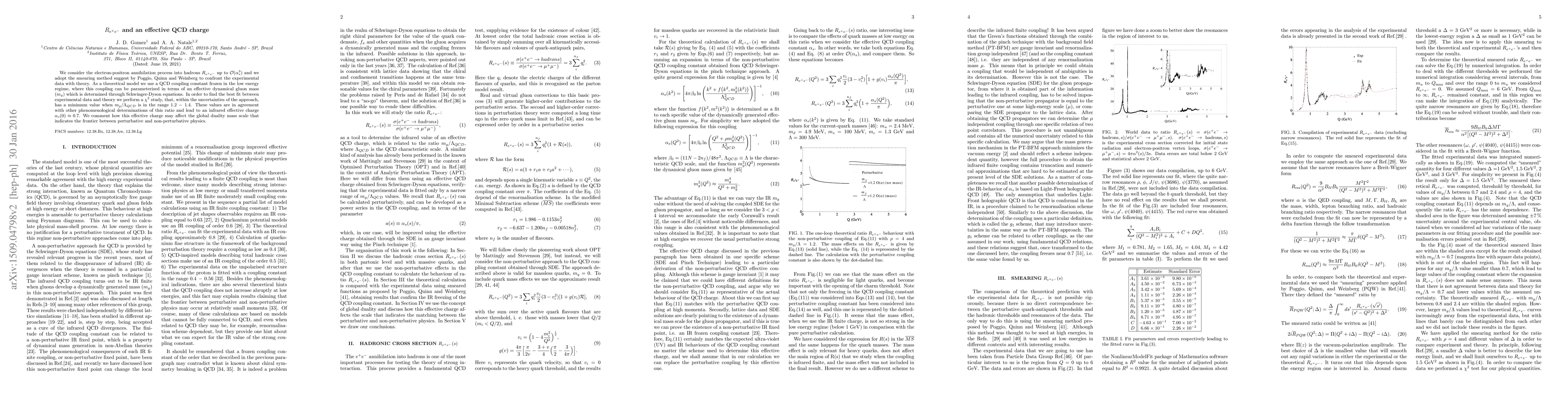 We consider the electron-positron annihilation process into hadrons $R_{e^+e^-}$ up to $\mathcal{O}(\alpha_{s}^{3})$ and we adopt the smearing method suggest by Poggio, Quinn and Weinberg to confront the experimental data with theory. As a theoretical model we use a QCD coupling constant frozen in the low energy regime, where this coupling can be parameterised in terms of an effective dynamical gluon mass ($m_g$) which is determined through Schwinger-Dyson equations. In order to find the best fit between experimental data and theory we perform a $\chi^2$ study, that, within the uncertainties of the approach, has a minimum value when $m_g/\Lambda_{QCD}$ is in the range $1.2 \, - \, 1.4$. These values are in agreement with other phenomenological determinations of this ratio and lead to an infrared effective charge $\alpha_s(0) \approx 0.7$. We comment how this effective charge may affect the global duality mass scale that indicates the frontier between perturbative and non-perturbative physics.