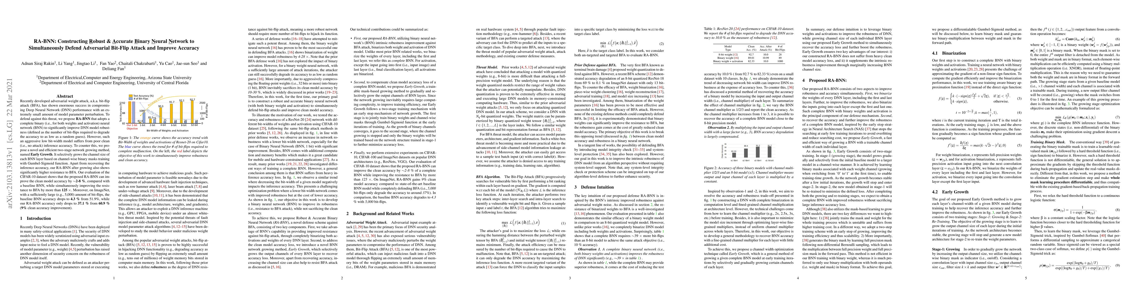 RA-BNN proposes a robust binary neural network to defend against adversarial bit-flip attacks while improving accuracy through a two-stage network growing method called Early-Growth. This method enhances both model robustness and clean inference accuracy, achieving significant improvements over baseline binary neural networks.