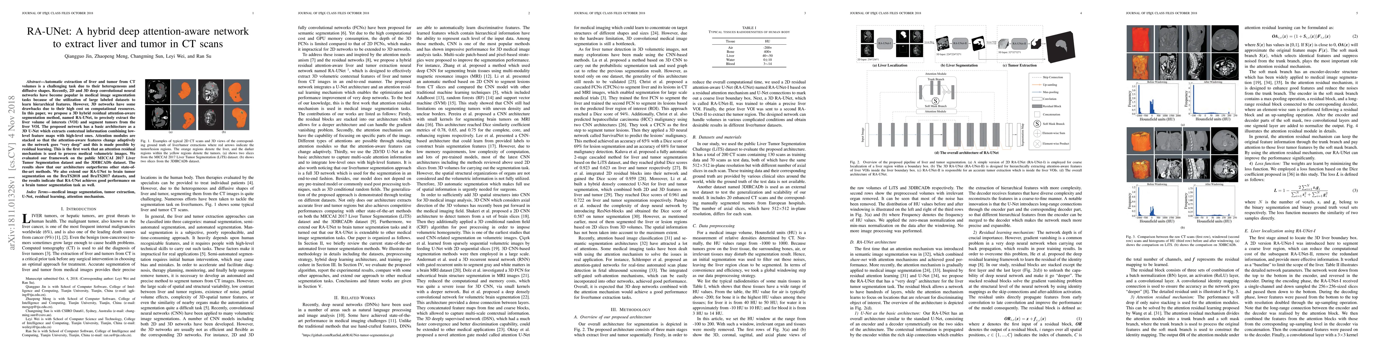 RA-UNet is a hybrid deep attention-aware network that combines 3D U-Net with attention modules and residual learning to accurately segment liver and tumors in CT scans. The proposed method outperforms existing state-of-the-art techniques on liver and brain tumor segmentation datasets.