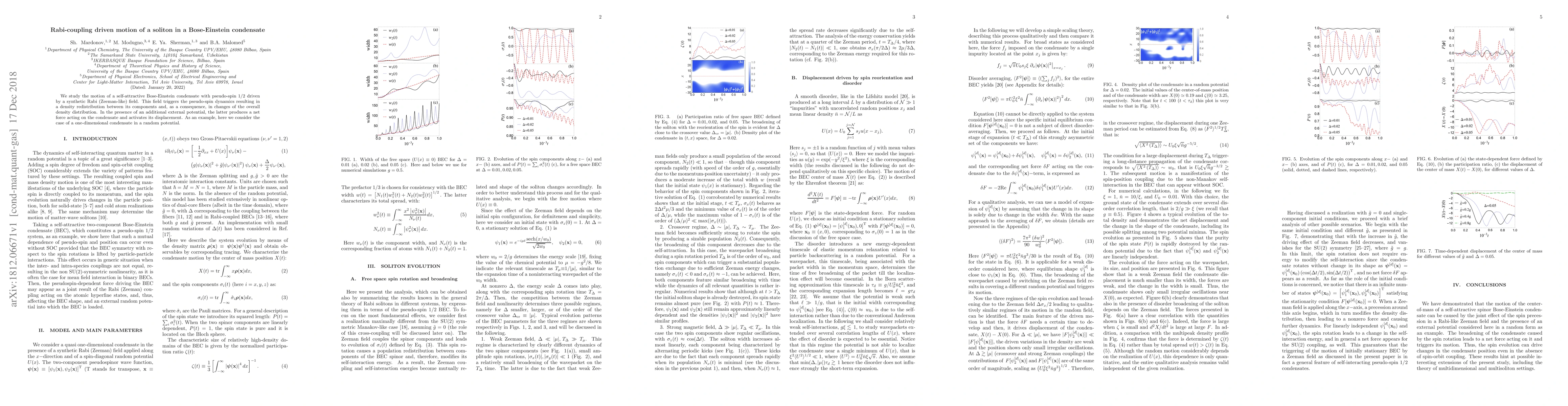 We study the motion of a self-attractive Bose-Einstein condensate with pseudo-spin 1/2 driven by a synthetic Rabi (Zeeman-like) field. This field triggers the pseudo-spin dynamics resulting in a density redistribution between its components and, as a consequence, in changes of the overall density distribution. In the presence of an additional external potential, the latter produces a net force acting on the condensate and activates its displacement. As an example, here we consider the case of a one-dimensional condensate in a random potential.