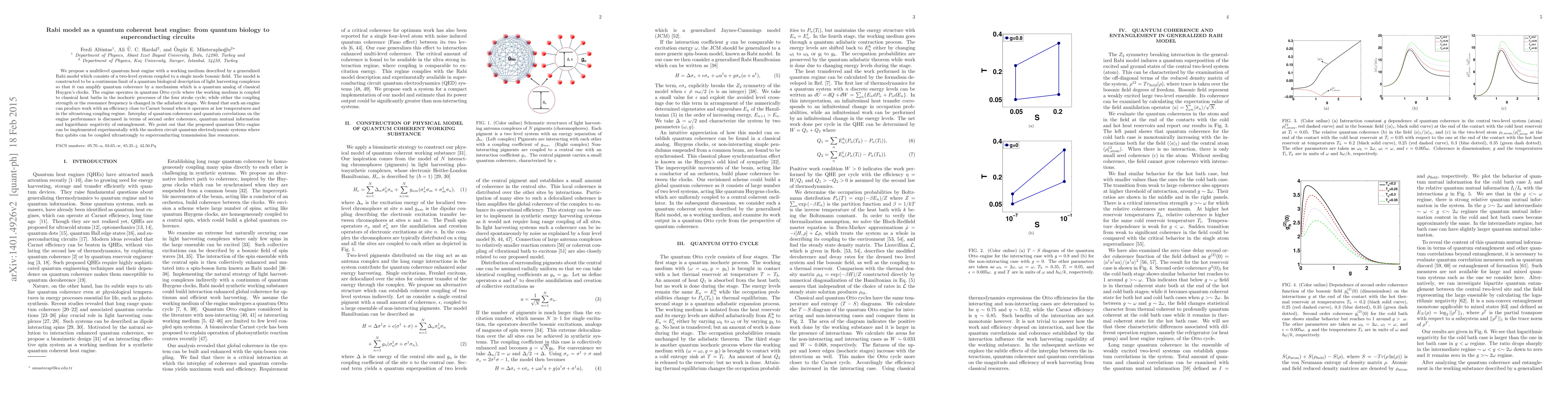 This research proposes a quantum heat engine based on a generalized Rabi model, inspired by quantum biology's light harvesting complexes. The engine, operating in a quantum Otto cycle, can produce work near the Carnot efficiency under low temperatures and ultrastrong coupling. It discusses the impact of quantum coherence and correlations on engine performance, suggesting experimental implementation with superconducting circuits.